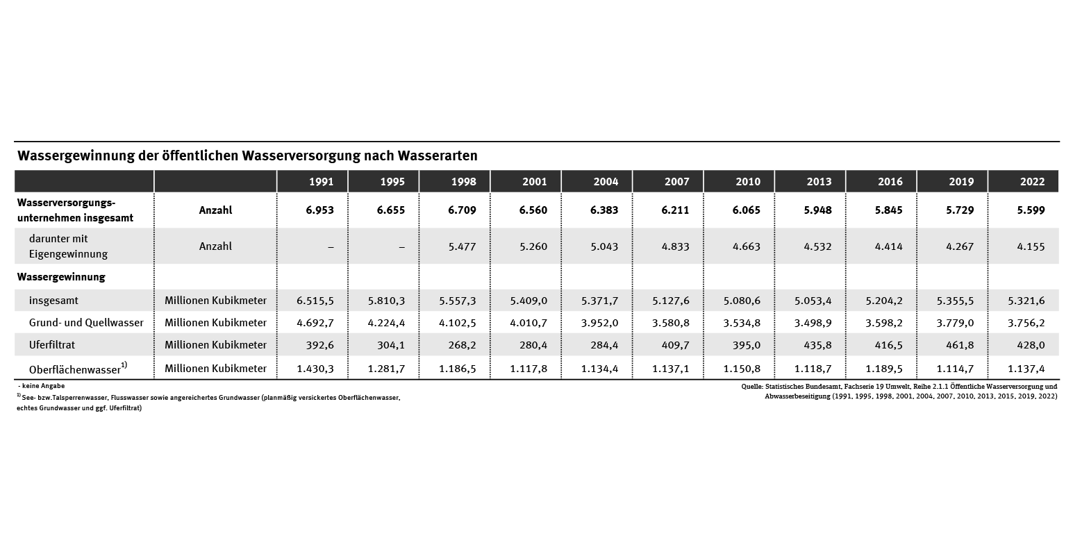 Die Wasserversorgungsunternehmen entnahmen in den Jahren 1991 bis 2022, trotz der Erhöhung, die wir seit 2013 beobachten, insgesamt weniger Wasser, um den Trinkwasserbedarf zu decken. Gegenüber den 5,3 Milliarden Kubikmeter (Mrd. m³) im Jahr 2022 waren es 1991 noch mehr als 6,5 Mrd. m³. Das ist ein Rückgang um 18 % (siehe Tab. „Wassergewinnung der öffentlichen Wasserversorgung nach Wasserarten“).