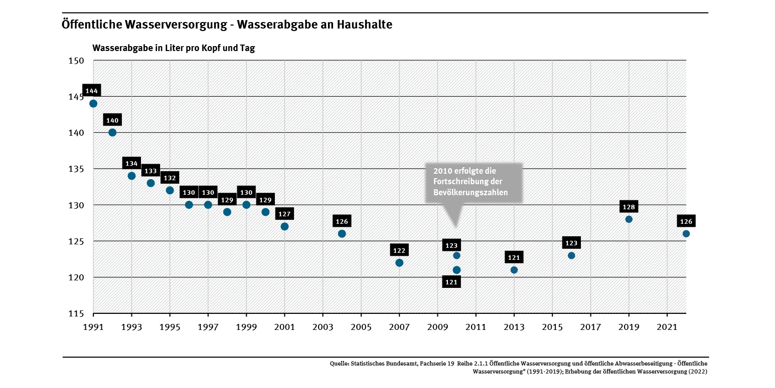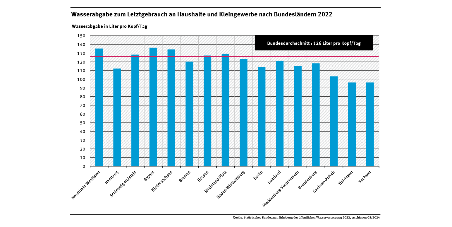 Die Wassereinsparung wurde aus zwei Gründen möglich: Den Wasserversorgungsunternehmen gelang es, die Wasserverluste etwa durch Rohrbrüche und Undichtigkeiten spürbar zu senken: Im Jahr 1991 gingen auf diese Weise noch 758 Mio. m³ verloren, im Jahr 2022 noch 469 Mio. m³. Das ist im europäischen Vergleich eine sehr geringe Verlustrate. Den Hauptanteil an der Einsparung hatte jedoch die gesunkene individuelle Wassernutzung. Lag die tägliche Wassernutzung 1991 noch bei 144 Litern pro Einwohner sind heute 126 Liter (l) ausreichend (siehe Abb. „Öffentliche Wasserversorgung - Wasserabgabe an Haushalte“). Dieser Durchschnittswert verteilt sich jedoch recht breit zwischen den einzelnen Bundesländern. In Nordrhein-Westfalen, Bayern und Niedersachsen nutzte eine Person im Schnitt circa 135 l täglich, in Thüringen und Sachsen hingegen nur 96 l (siehe Abb. „Wasserabgabe zum Letztgebrauch an Haushalte und Kleingewerbe nach Bundesländern 2022“). Der Anstieg der Trinkwassernutzung von 2016 (123 l) auf 2019 (128 l) war dem höheren Wasserbedarf während der heißen und trocknen Sommer geschuldet. Demgegenüber wurde 2022 ein Rückgang auf 126 l pro Person/ Tag verzeichnet.