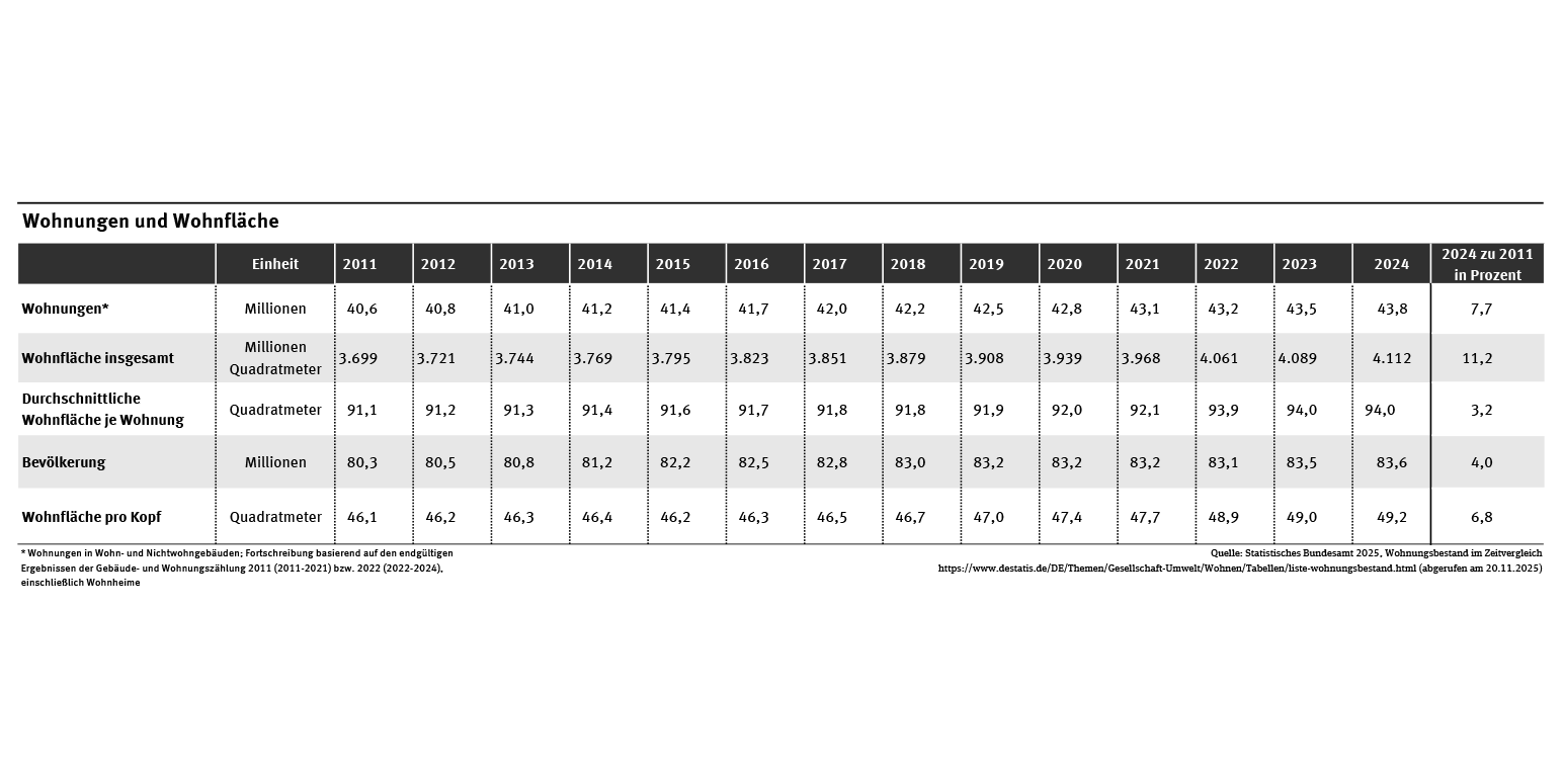 Im Jahr 2024 gab es in Deutschland rund 43,8 Millionen (Mio.) Wohnungen in Wohn- und Nichtwohngebäuden, einschließlich Wohnheimen. Das waren rund 3,1 Mio. Wohnungen mehr als im Jahr 2011 (7,7 %). Im gleichen Zeitraum stieg die tatsächlich genutzte Wohnfläche deutlich stärker um 11,2 % an. Grund dafür war auch die im Vergleich zu 2011 größere durchschnittliche Wohnfläche der Wohnungen im Bestand von 2024. Die Wohnfläche je Wohnung betrug 2024 im Durchschnitt 94,0 Quadratmeter (siehe Tab. „Wohnungen und Wohnfläche“).
