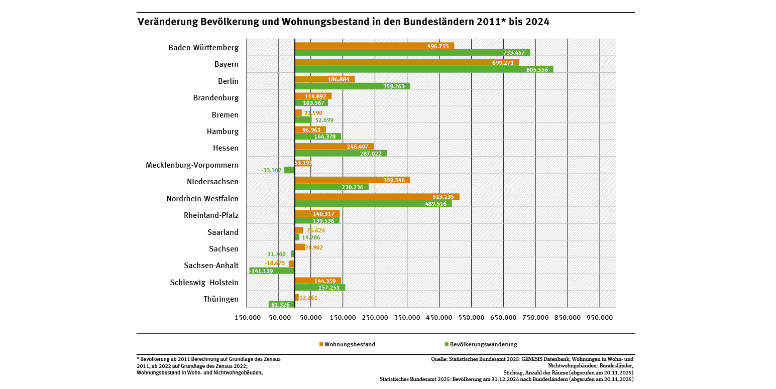Zwischen 2011 und 2024 nahm die Zahl der Wohnungen in Deutschland um 7,7 % zu, während die Bevölkerung im gleichen Zeitraum um rund 4,0 % wuchs. Hauptursache für den Bevölkerungszuwachs war die Zuwanderung der letzten Jahre. Die Entwicklung verlief unterschiedlich: Während in den meisten Bundesländern die Bevölkerung zunahm, schrumpfte sie in Sachsen-Anhalt (-6,2 %), Thüringen (-3,7 %), Mecklenburg-Vorpommern (-2,1 %) und in Sachsen (-0,3 %). Im gleichen Zeitraum stieg der Wohnungsbestand jedoch in fast allen Bundesländern außer in Sachsen-Anhalt (-1,45 %), also auch in Thüringen (+1,1 %), in Mecklenburg-Vorpommern (+6,1 %) und in Sachsen (+1,4 %). Nur in Berlin und Bremen wächst die Bevölkerung schneller als der Wohnungsbestand. Hingegen wächst in den anderen Ländern der Wohnungsbestand teils wesentlich schneller als die Bevölkerung (siehe Abb. „Bevölkerung und Wohnungsbestand in den Bundesländern 2011 bis 2024“).