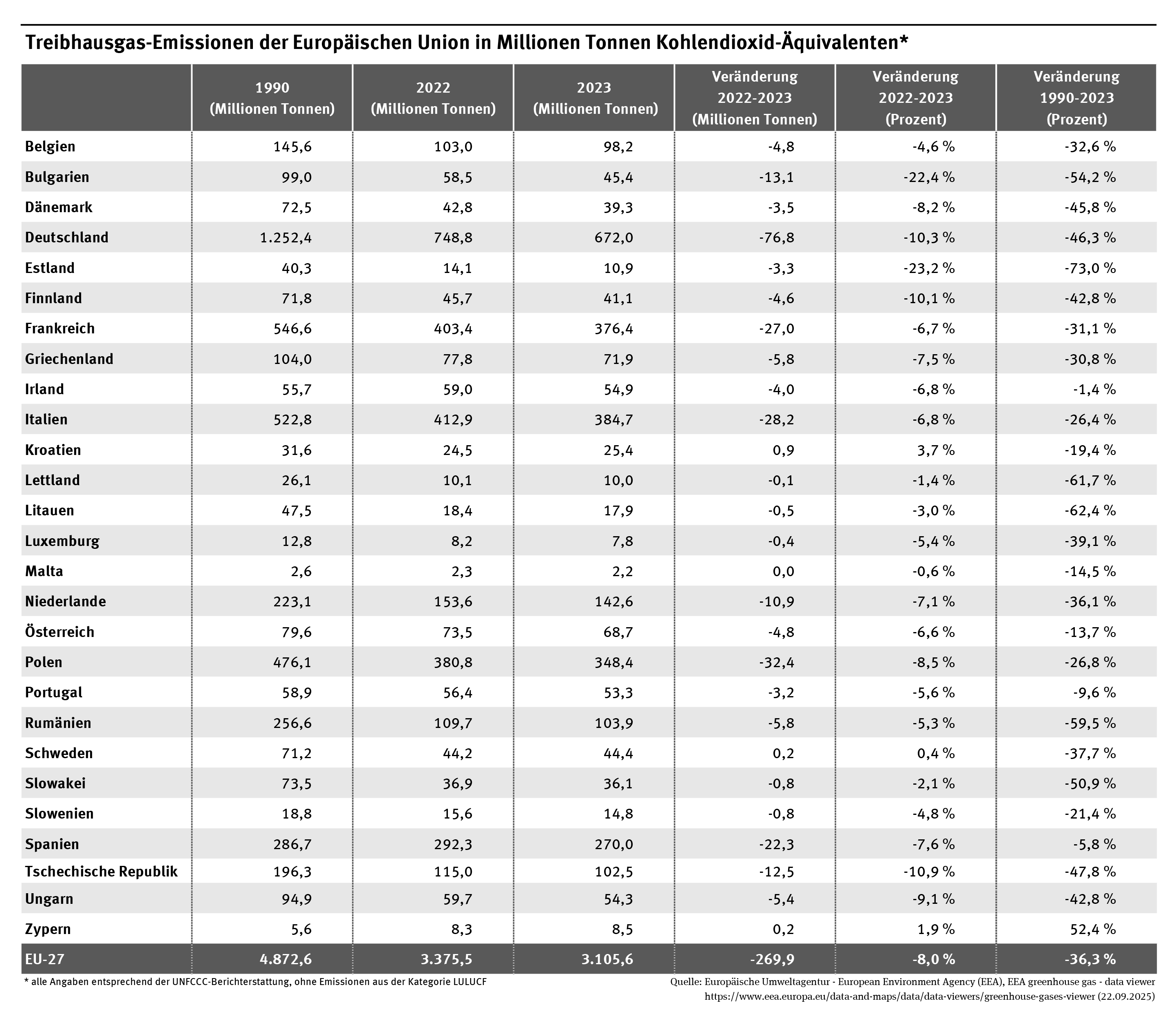 2023 verursachte die EU-27 insgesamt rund 3.106 Millionen Tonnen (Mio. t) Treibhausgase in Kohlendioxid (CO₂)-Äquivalenten (siehe Tab. „Treibhausgas-Emissionen der Europäischen Union“). Deutschland, Frankreich, Italien und Polen verursachten zusammen etwa 57 % davon. Deutschland allein steuerte bereits über 21,6 % bei.