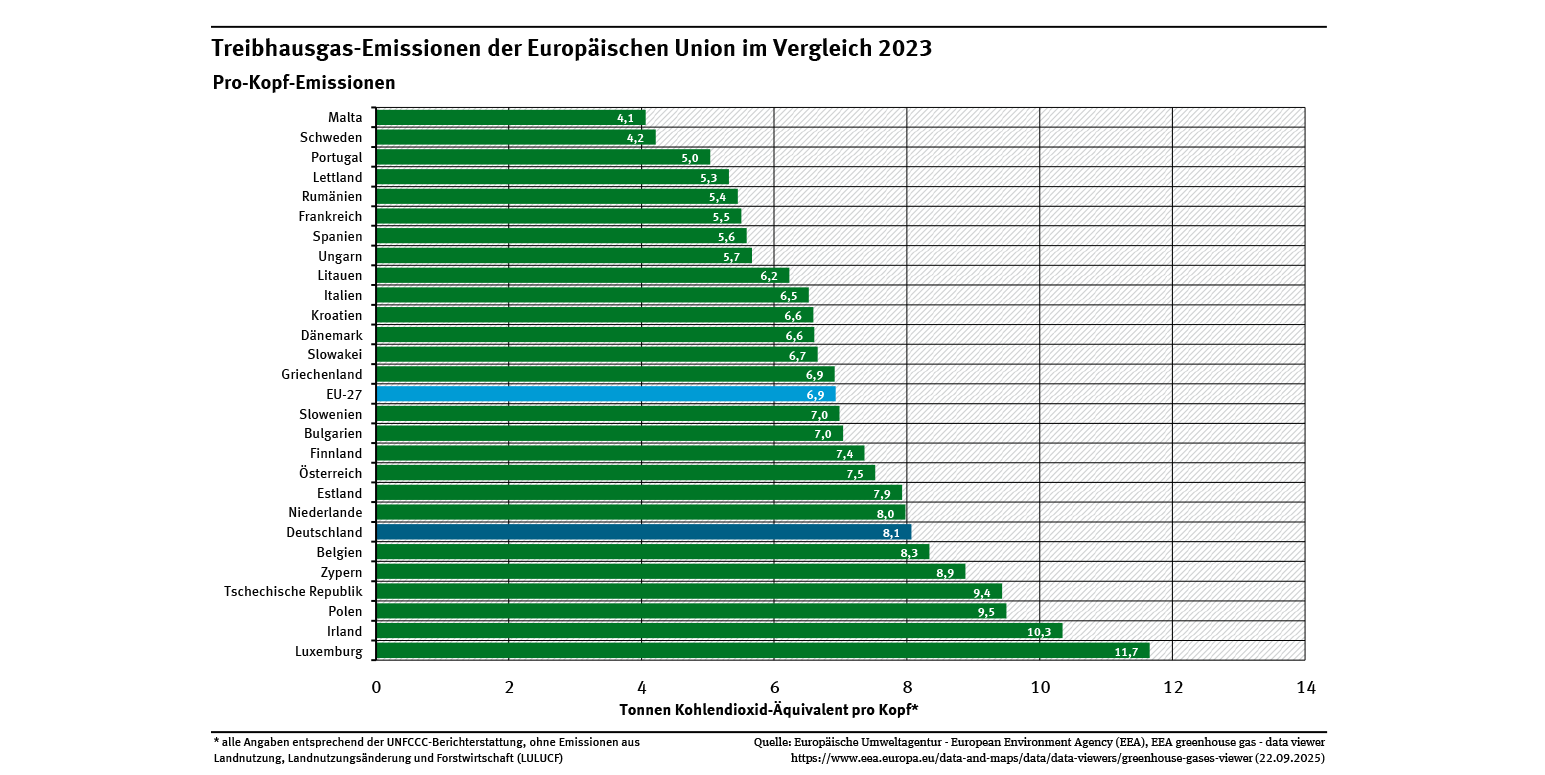Bezieht man die Treibhausgas-Emissionen 2023 auf die jeweiligen Bevölkerungen, so liegen die verursachten Mengen zwischen Malta mit nur 4,1 Tonnen (t) CO2-Äquivalenten pro Kopf und Luxemburg mit 11,7 t Kohlendioxid-Äquivalenten pro Kopf. Frankreich und Italien liegen mit ca. 5,5 bzw. 6,5 t eher am unteren Ende, Polen mit 9,5 t und Deutschland mit 8,1 t Kohlendioxid-Äquivalenten pro Kopf hingegen im oberen Mittelfeld (siehe Abb. „Treibhausgas-Emissionen der Europäischen Union im Vergleich 2023 - Pro-Kopf-Emissionen“). Die Pro-Kopf Menge für die EU-27 insgesamt liegt bei 6,9 t.