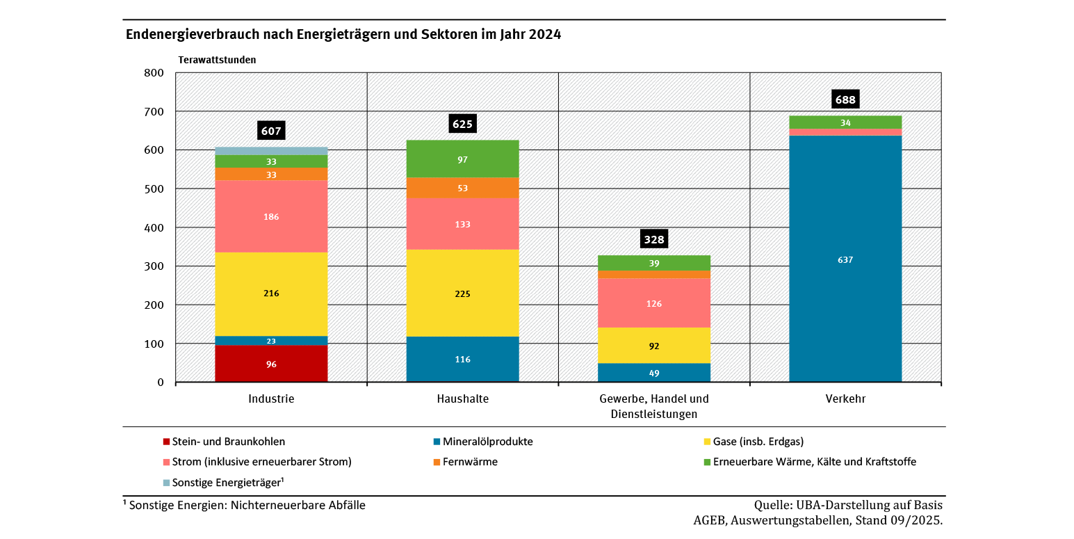 Im Verkehrssektor werden zu über 90 % Kraftstoffe aus Mineralöl eingesetzt, Biokraftstoffe und Strom spielen bislang nur eine geringfügige Rolle. Fast die gesamte im Verkehr eingesetzte Energie wird zur Erzeugung von mechanischer Energie verwendet, wovon bei Verbrennungsmotoren durchschnittlich jedoch nur weniger als die Hälfte für den Antrieb umgewandelt wird. Ein großer Anteil geht als Abwärme verloren. Der Anteil des Stroms am Endenergieverbrauch im Verkehr beträgt etwas mehr als 2 %, stieg in den letzten Jahren jedoch.