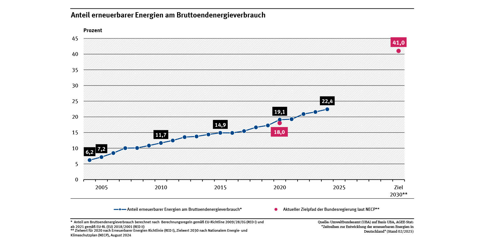 Ein Diagramm zeigt den Anteil erneuerbarer Energien am Brutto-Endenergieverbrauch (dies entspricht dem Endenergieverbrauch zuzüglich Leitungsverlusten und Eigenverbräuchen von Kraftwerken). Der Anteil stieg von 2004 bis 2024 von 6,2 % auf 22,4 %. Anteil erneuerbarer Energien am Bruttoendenergieverbrauch