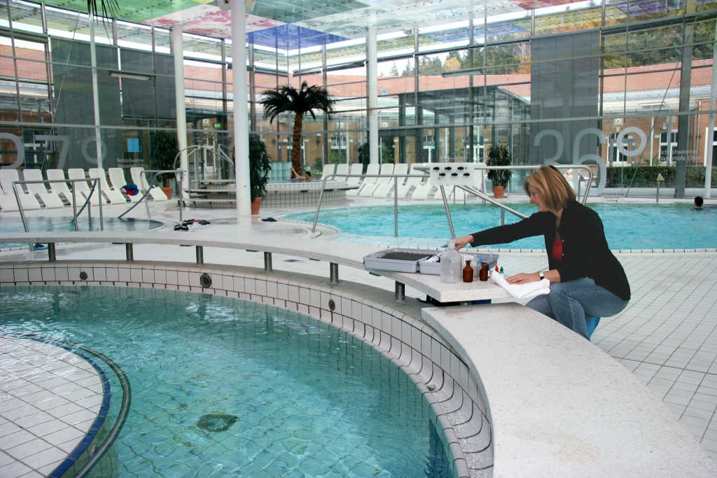 Eine Frau entnimmt in einem öffentlichen Hallenbad eine Wasserprobe aus einem Schwimmbecken.