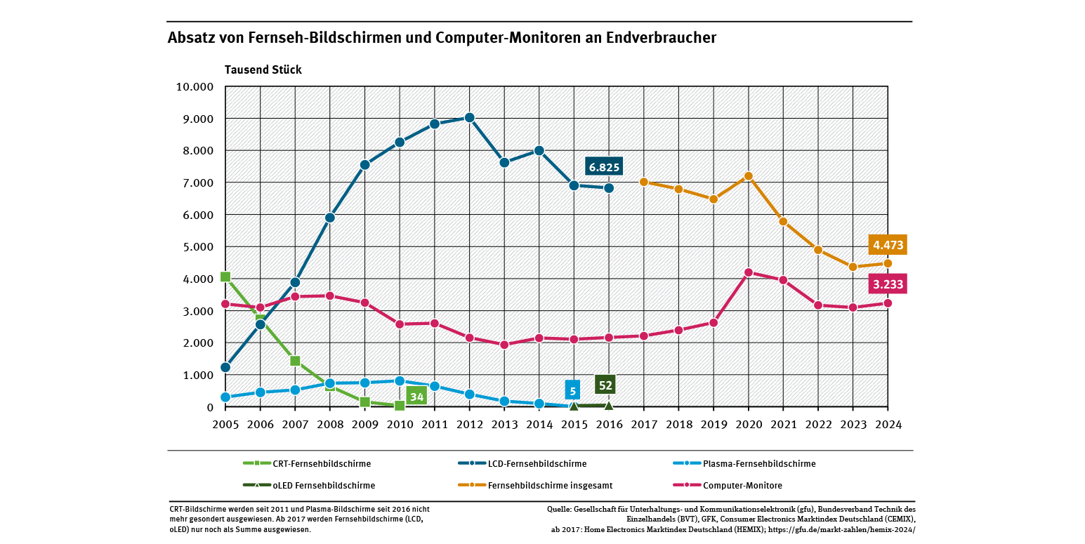 Die Flachbildschirmtechniken haben die klassischen Röhrenfernsehgeräte mit Kathodenstrahlröhren (Englisch: Cathode Ray Tube, CRT) abgelöst. CRT-Geräte werden in Deutschland nicht mehr auf den Markt gebracht. In Deutschland wurden im Jahr 2024 insgesamt ca. 4,47 Millionen (Mio.) Fernsehbildschirme mit Flüssigkristallanzeige (englisch: Liquid Crystal Display, LCD) sowie OLED-Technologie (englisch: Organic Light Emitting Diode, OLED) verkauft. Gegenüber dem Vorjahr ist dies eine Steigerung der Verkaufsmenge um 2,5 % (HEMIX, GfU-Statistik). Flachbildschirmgeräte mit Plasmaanzeige konnten sich nicht durchsetzen und werden seit dem Jahr 2016 in Deutschland nicht mehr verkauft. Die Absatzzahlen für Fernsehbildschirme werden seit dem Jahr 2017 nur noch für LCD- und OLED-Bildschirme zusammen ausgewiesen. Außerdem wurden 2024 rund 3,23 Mio. Computermonitore in Deutschland verkauft. Die Verkaufsmenge ging, nach einem sprunghaften Anstieg im Jahr 2020, um über 20 % im Vergleich zum aktuellen Jahr zurück (siehe Abb. „Absatz von Fernseh-Bildschirmen und Computer-Monitoren an Endverbraucher“).