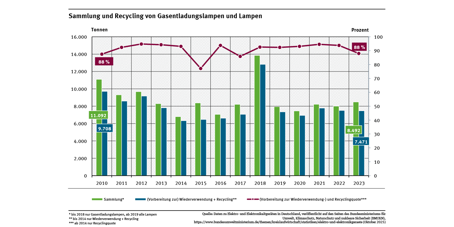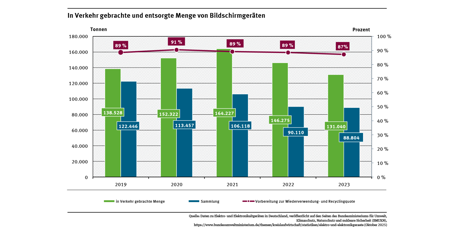 Mit der Änderung der Elektrogerätekategorien im August 2018 werden seit 2019 erstmals auch statistische Daten zur gesamten Menge der in Verkehr gebrachten und entsorgten Bildschirmgeräte ausgewiesen, da diese nun eine eigene Gerätekategorie darstellen. Hierzu zählen Bildschirme, Monitore und Geräte, die Bildschirme mit einer Oberfläche von mehr als 100 Quadratzentimeter enthalten (z.B. Fernsehgeräte, Flachbildschirme, digitale Foto- und Bilderrahmen, PC-Monitore, Laptops, Notebooks, Tablets und Tablet-PCs) (siehe Abb. „In Verkehr gebrachte und entsorgte Menge von Bildschirmgeräten“). So wurden im Jahr 2023 131.040 Tonnen (t) Bildschirmgeräte in Verkehr gebracht und 88.804 t Altgeräte gesammelt. Die Quote für die Vorbereitung zur Wiederverwendung + Recycling der Altgeräte betrug rund 87,2 %.