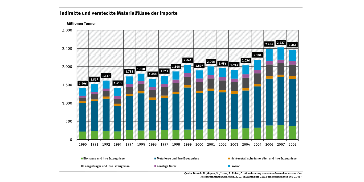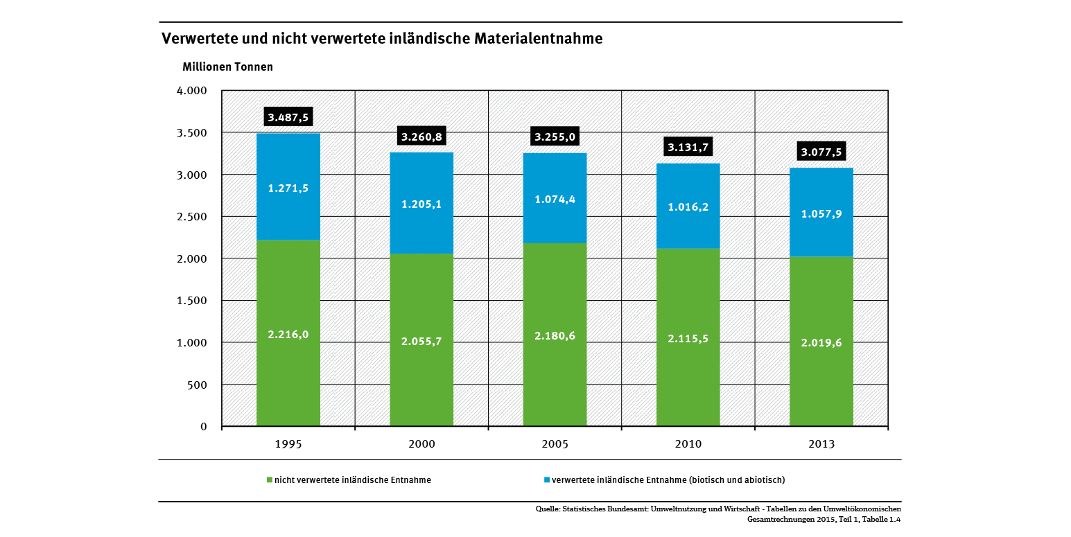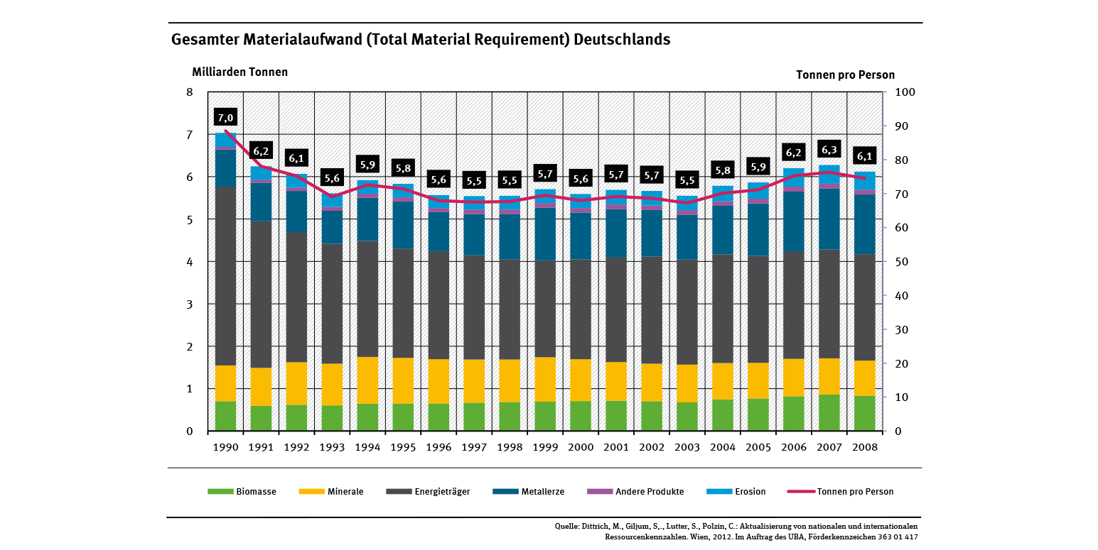 Die Kenngröße „Gesamter Materialaufwand“ umfasst verwertete Rohstoffe und nicht verwertete Materialentnahmen. In Fachkreisen wird für den Indikator oft auch die englische Bezeichnung „Total Material Requirement“ und die damit einhergehende Abkürzung „TMR“ verwendet. Der TMR erfasst alle Materialentnahmen in In- und Ausland, die wir durch Produktion und Konsum in Deutschland auslösen (siehe Schaubild „Stoffstromindikatoren“).
