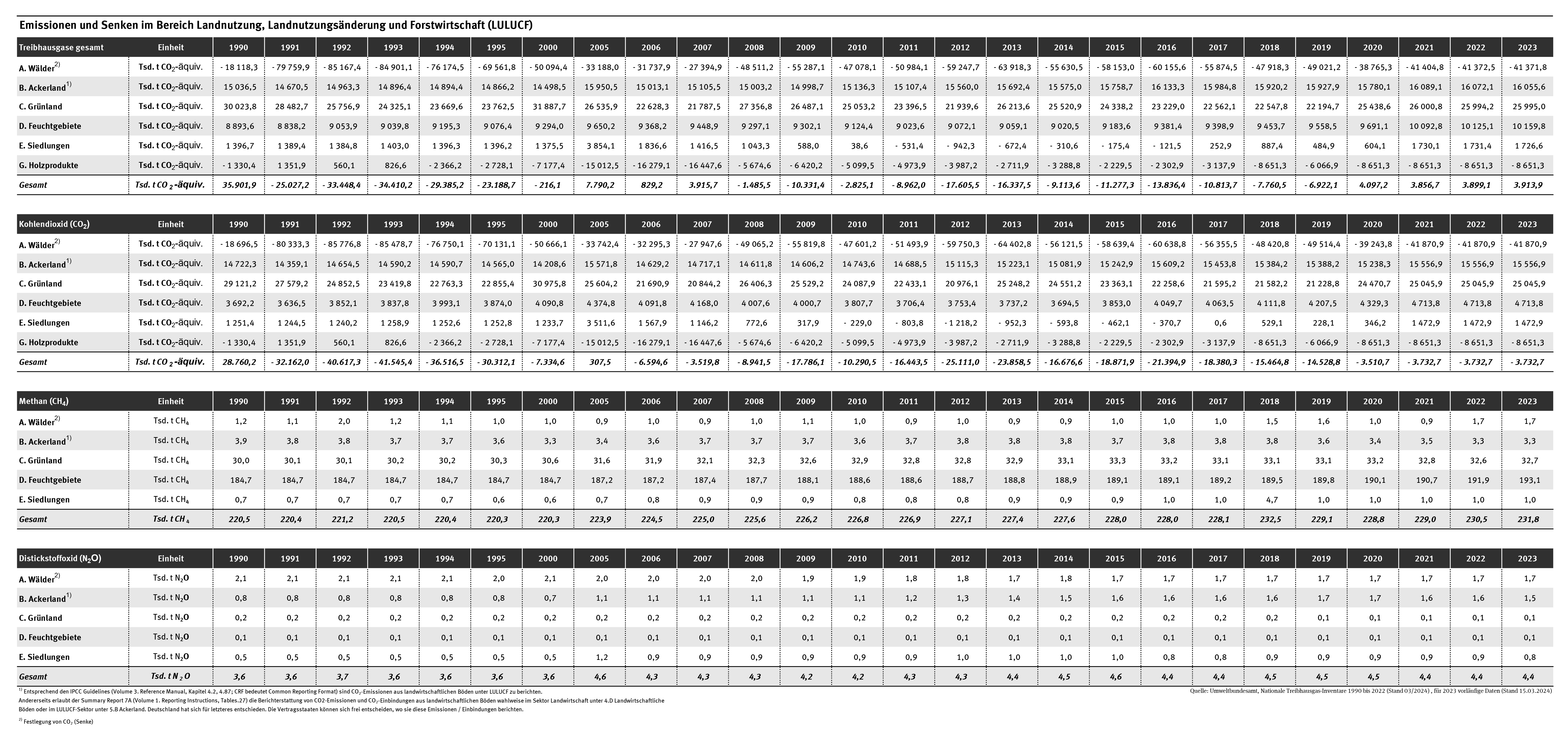 Die Tabelle zeigt für die Jahre 1990 bis 2023, welche THG-Emissionen in den Landnutzungskategorien aufgenommen und abgegeben wurden. Tab: Emissionen und Senken im Bereich Landnutzung, Landnutzungsänderung und Forstwirtschaft