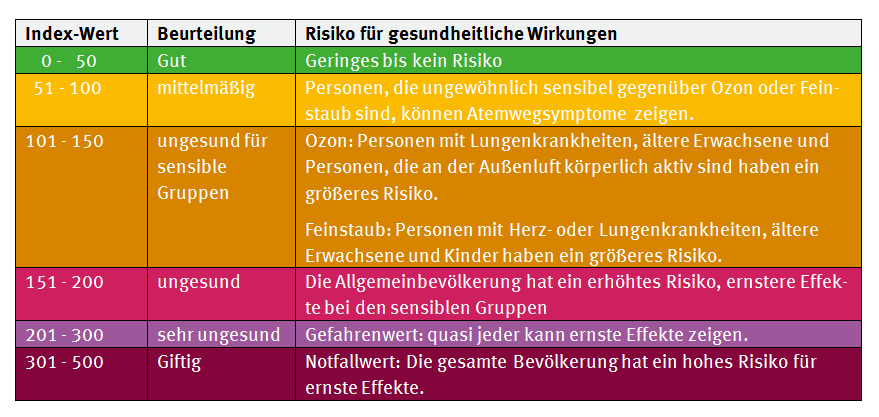 Tabelle mit Grenzwerten zur gesundheitlichen Belastung US-amerikanischer Indexwert zur gesundheitlichen Belastung