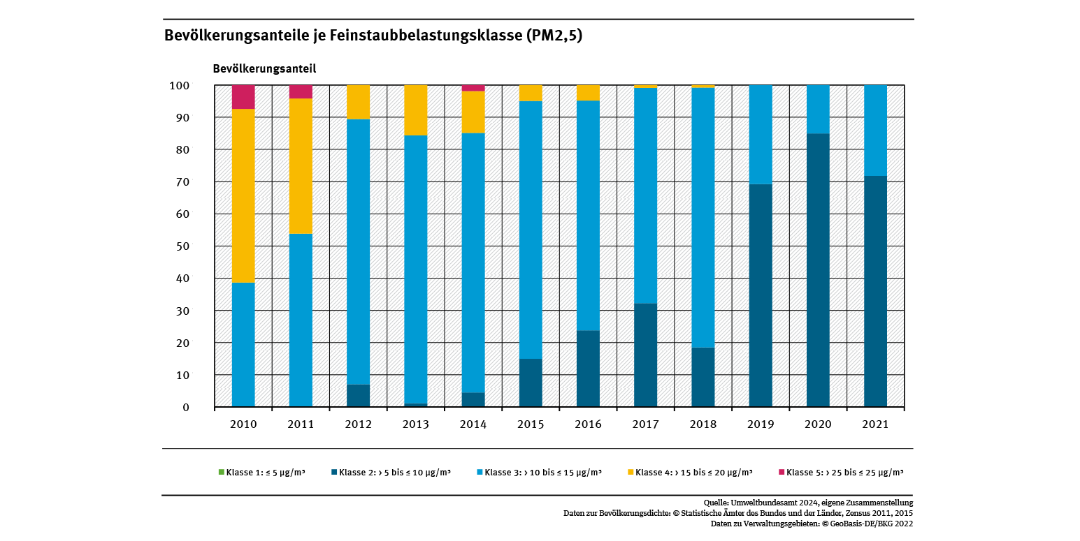 Ein weltweit und auch in Deutschland besonders relevanter Luftschadstoff ist Feinstaub (engl. Particulate Matter; PM). Grundsätzlich ist in den letzten Jahren die Feinstaubbelastung in Deutschland deutlich zurückgegangen. Für Feinstaub mit einem Partikeldurchmesser kleiner als 2,5 Mikrometer (PM2,5) empfiehlt die Weltgesundheitsorganisation (WHO), Konzentrationen von 5 Mikrogramm pro Kubikmeter (µg/m³) im Jahresmittel nicht zu überschreiten. Neue europäische Studien zeigen jedoch, dass es grundsätzlich keine Feinstaubkonzentration gibt, unterhalb der gesundheitsschädigende Wirkungen sicher ausgeschlossen werden können.