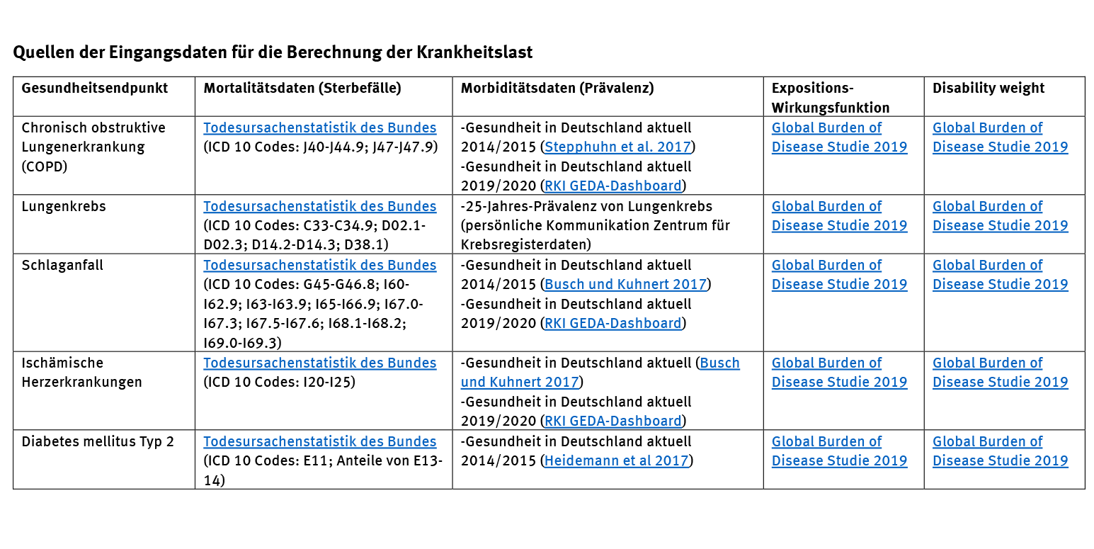 - Erstmalig wurde zur Bestimmung der Exposition direkt auf PM2,5-Mess- und Modelldaten zurückgegriffen. Eine Umrechnung von PM10 auf PM2,5 war somit nicht mehr nötig.