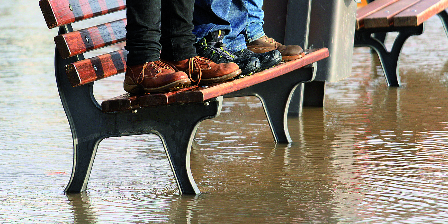 People standing on a seat bench surrounded by water