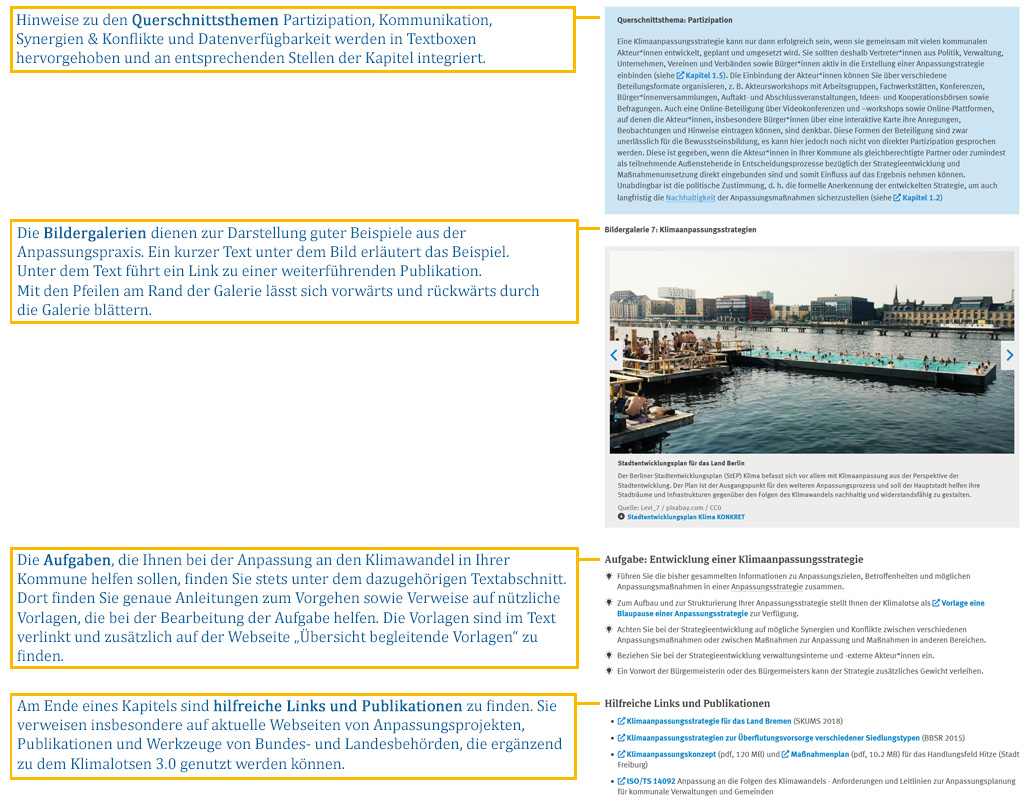 • Gute Beispiele aus der kommunalen Anpassungspraxis in Form von Beispielgalerien (z. B. Stadtratsbeschlüsse, Stadtklimakarten, Anpassungsstrategien)
