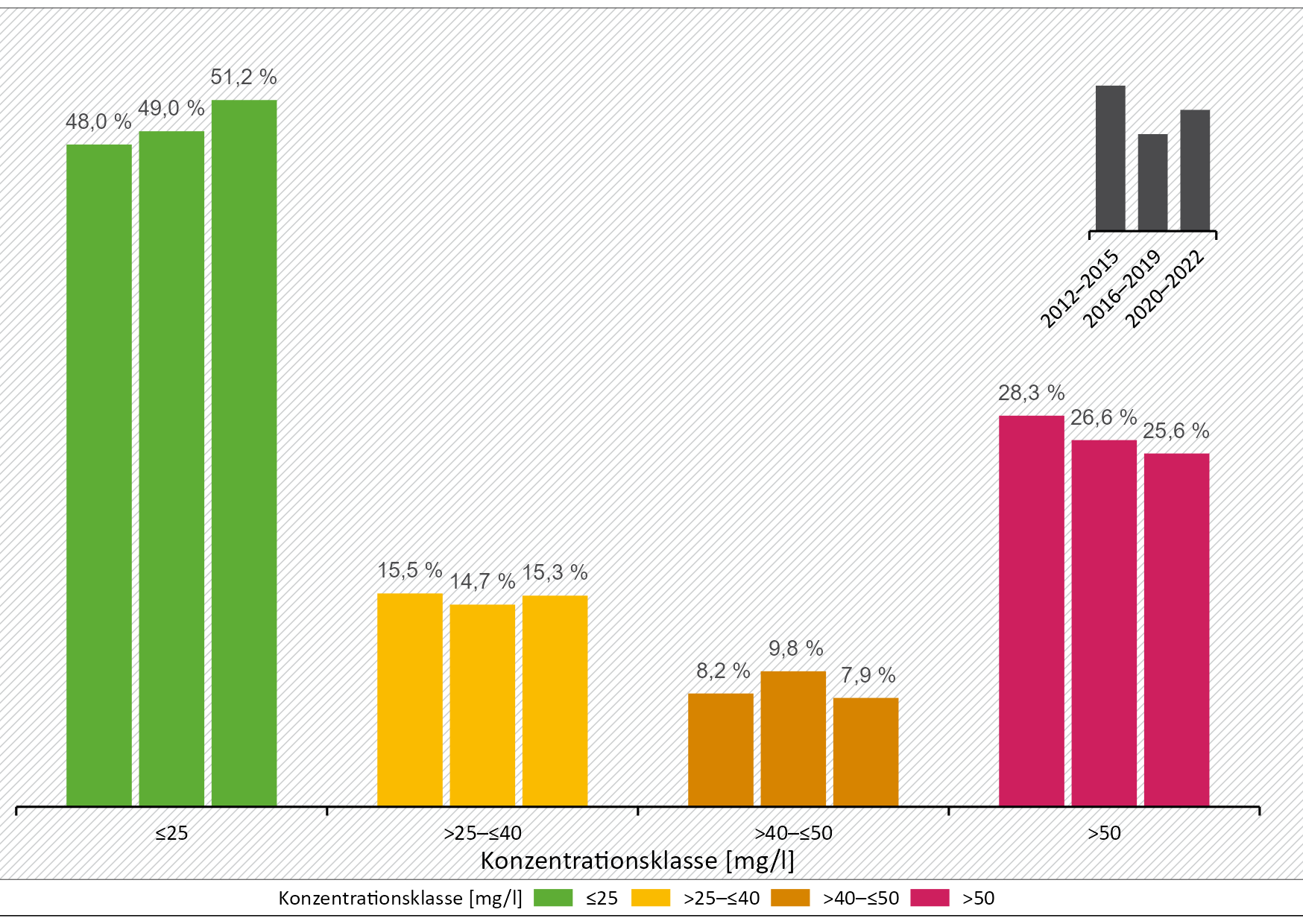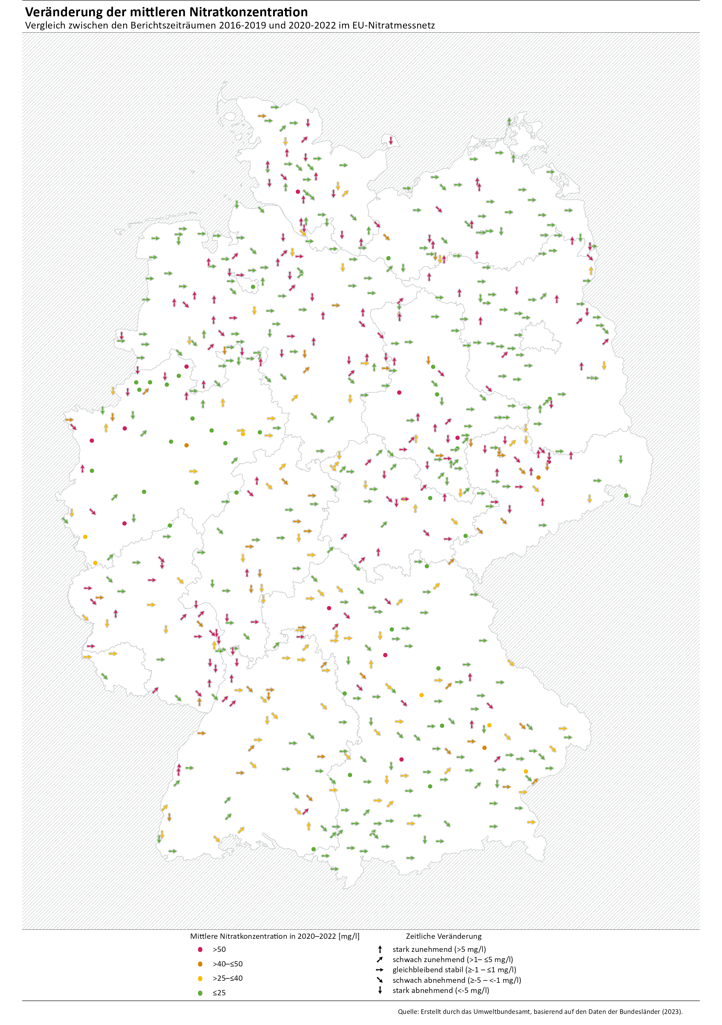 Im aktuellen Berichtszeitraum ist festzustellen, dass die Nitratkonzentrationen im Grundwasser an überwiegend landwirtschaftlich beeinflussten Messstellen (EU-Nitratmessnetz) weiterhin leicht sinken. Deutschland verzeichnet somit seit 2012 einen leicht positiven Trend bei der Gewässerbelastung durch Nährstoffe. Die Nitratbelastung des Grundwassers der überwiegend landwirtschaftlich beeinflussten Messstellen ist jedoch weiterhin zu hoch und die beobachteten Verbesserungen sind als nicht ausreichend zu bewerten. Im aktuellen Berichtszeitraum von 2020 bis 2022 zeigen die Daten des EU-Nitratmessnetzes, dass 25,6 % der Grundwassermessstellen durchschnittliche Nitratkonzentrationen von über 50 mg/l aufweisen (Abbildung 4). Dieser Anteil ist etwas niedriger als im vorangegangenen Berichtszeitraum von 2016 bis 2019, wo er 26,6 % betrug. Der Anteil der nicht oder nur geringfügig belasteten Messstellen mit Nitratkonzentrationen von 25 mg/l oder darunter ist leicht gestiegen, und zwar von 49,0 % auf 51,2 % im Vergleich zum vorherigen Berichtszeitraum. Betrachtet man das EU-Nitratmessnetz über alle Konzentrationsklassen hinweg, dann zeigt sich, dass die mittlere Nitratkonzentration im Zeitraum 2020 bis 2022 im Vergleich zum vorherigen Berichtszeitraum an 34,4 % der Messstellen zurückging. Abbildung 5 gibt einen Überblick über die räumliche Verteilung und die Veränderungen der mittleren Nitratkonzentrationen der einzelnen Messstellen des EU-Nitratmessnetzes im Vergleich zur Berichtsperiode 2016 bis 2019.