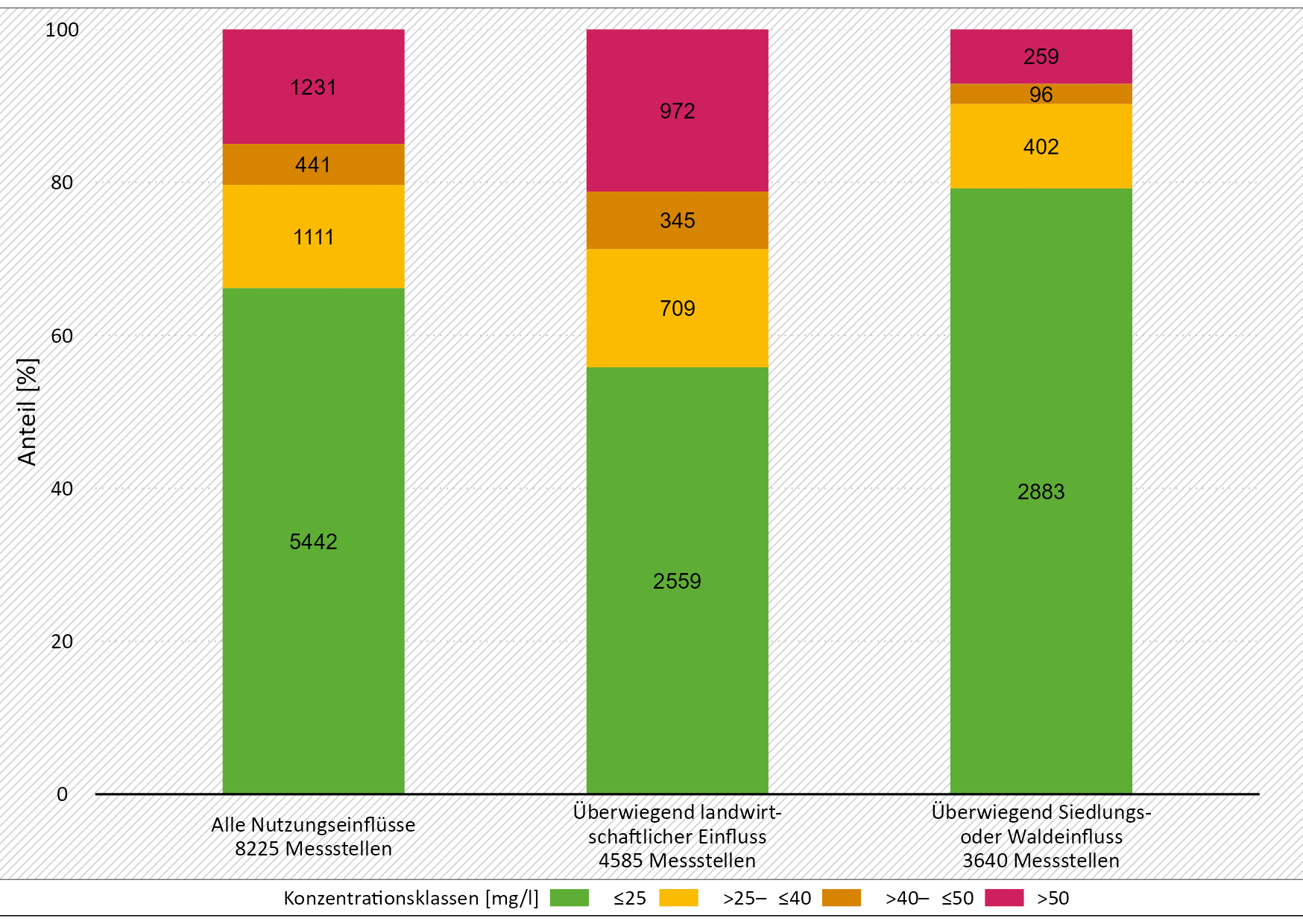 Im Jahr 2023 wurde die Nitratkonzentration des Grundwassers an 1135 Messstellen des EUA-Grundwassermessnetzes untersucht. 67,1 Prozent aller Messstellen waren nicht oder nur geringfügig belastet, da die Nitratkonzentration zwischen 0 und 25 Milligramm pro Liter (mg/l) lag. Bei 18 Prozent der Messstellen lag die Nitratkonzentration zwischen 25 und 50 mg/l. Diese Messstellen waren deutlich bis stark mit Nitrat belastet. Die übrigen 15 Prozent der Messstellen enthielten zum Teil deutlich mehr als 50 mg/l Nitrat (Abbildung 1). Grundwasser, das derart mit Nitrat belastet ist, kann nicht ohne Weiteres zur Trinkwassergewinnung genutzt werden, da es den Grenzwert von 50 mg Nitrat pro Liter aus der Trinkwasserverordnung (TrinkwV 2001) überschreitet.