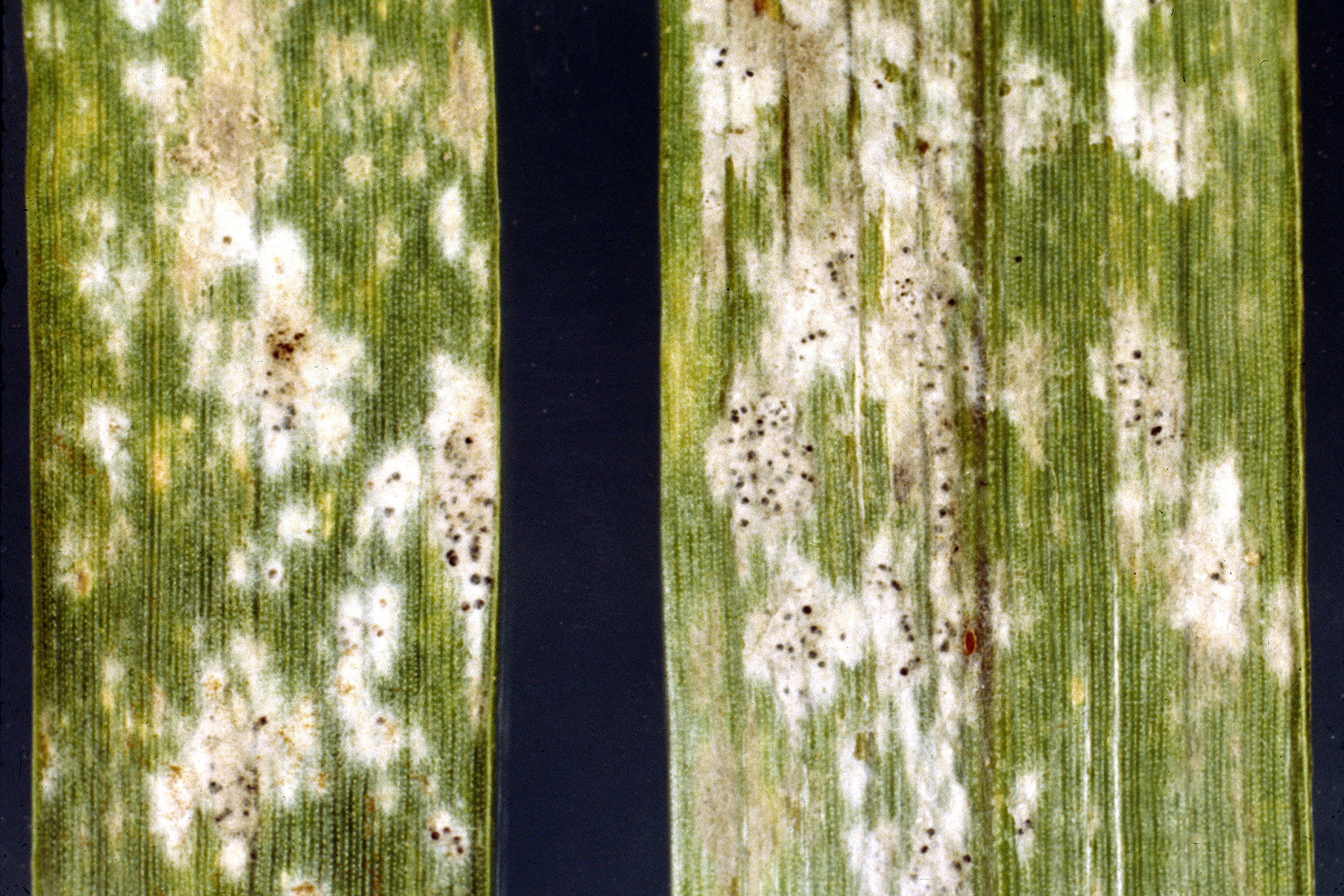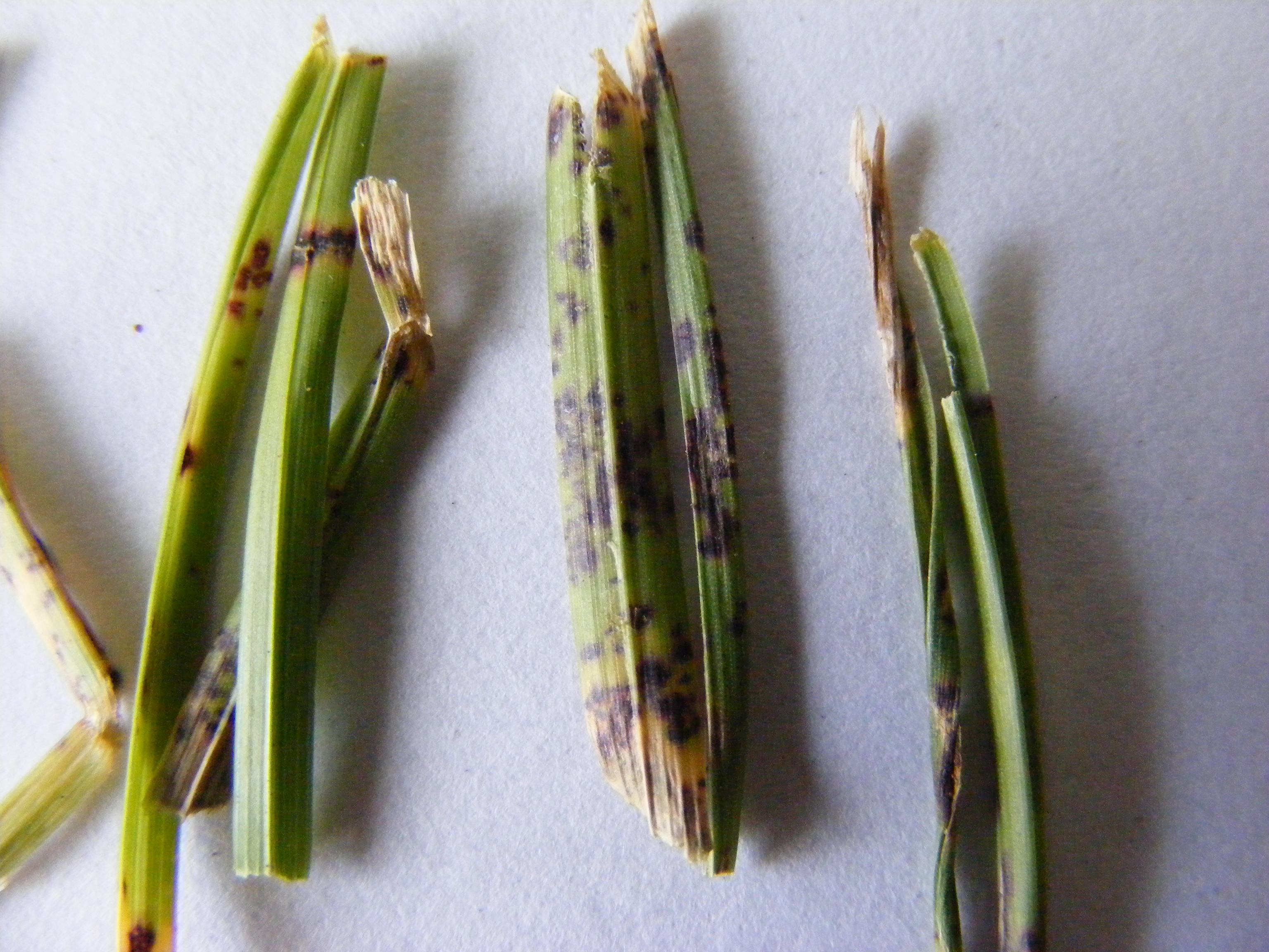 • Blattflecken durch die Pilze Drechslera spp., Bipolaris spp. und Curvularia spp.; erkennbar an scharf begrenzten dunklen Flecken an den Halmen; im Zentrum der Flecken stirbt das Blattgewebe ab.