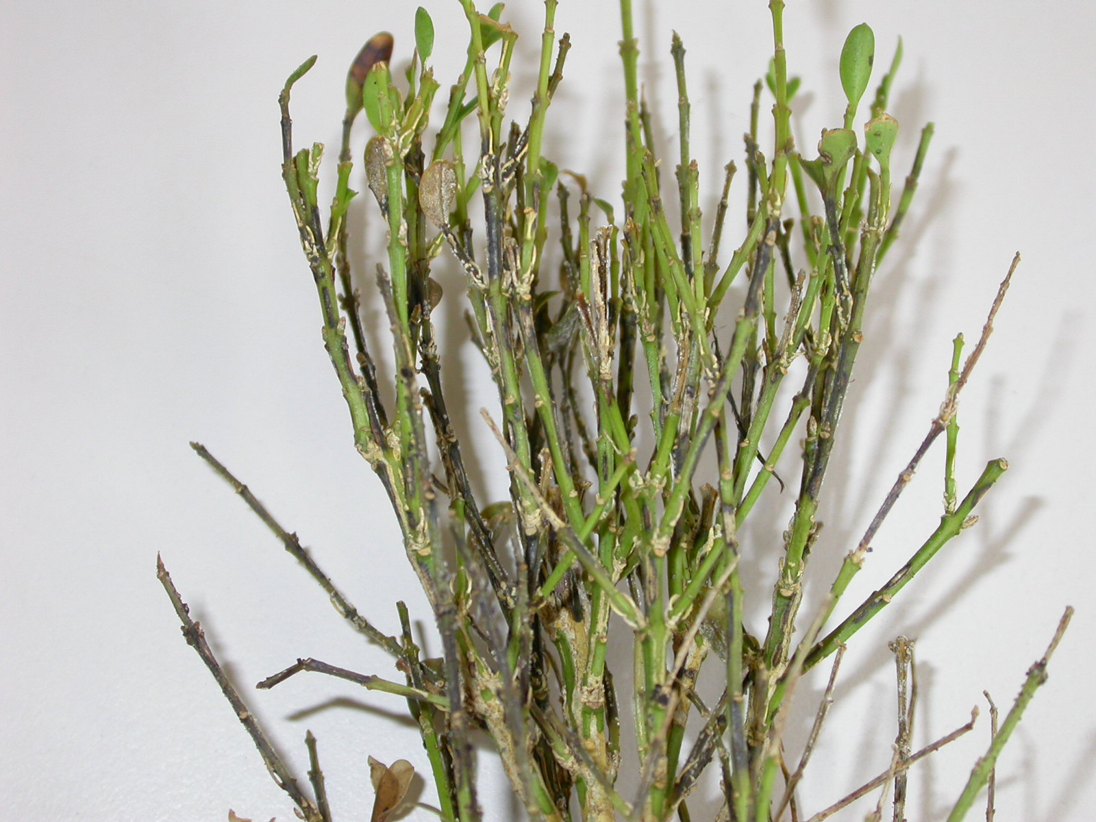 Der Pilz Volutella buxi ist verantwortlich für das auch als Buchsbaumkrebs bezeichnete Zweigsterben. Der Erreger Cylindrocladium buxicola verursacht das seit 2004 auch in Deutschland bekannte Buchsbaumsterben. In beiden Fällen treiben erkrankte Zweige bei schwachem Befall wieder aus, bei starkem Befall sterben sie ab. Optisch können Sie die beiden Pilzerkrankungen an folgenden Merkmalen unterscheiden: Beim Zweigsterben verlieren die Blätter zunächst ihren Glanz, dann werden sie braun und vertrocknen, bleiben aber lange an den Trieben haften. Auf den Blattunterseiten sehen Sie hellrosafarbene Pünktchen, das sind die Sporenlager, über die sich der Pilz fortpflanzt. Vor allem an älteren Trieben zeigen sich Risse und Wucherungen. Beim Buchsbaumsterben werden die Blätter ebenfalls braun, fallen jedoch rasch ab. Auf den Blattunterseiten ist ein weißlicher Belag zu erkennen; auch hierbei handelt es sich um Pilzsporen. Zudem bilden sich beim Buchsbaumsterben auf den Trieben gut erkennbare schwarze Längsstreifen.