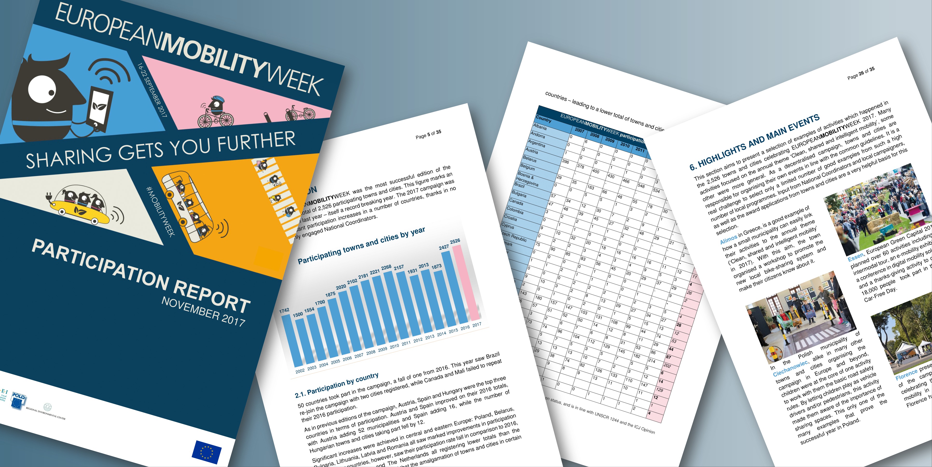 Der Teilnahmebericht der EMW fasst die wichtigsten Daten zur EMW 2017 zusammen und vergleicht sie mit vergangenen Jahren. 2017 war das bisher erfolgreichste Jahr der EUROPÄISCHEN MOBILITÄTSWOCHE: 2.526 Kommunen aus 50 Ländern haben sich beteiligt – 524 davon in allen drei Kategorien „Autofreier Tag“, „Woche der Aktivitäten“ und „Permanente Maßnahme“. Es fanden beeindruckende 1.352 autofreie Tage statt und 7.993 permanente Maßnahmen wurden in 1.295 Kommunen umgesetzt. Diese Zahlen zeigen, dass viele Kommunen nachhaltige Mobilität vor Ort aktiv gestalten – und das auch außerhalb Europas. So haben sich in diesem Jahr beispielsweise auch Kommunen aus den USA, Brasilien oder Südkorea an der EMW beteiligt. Diese und viele weitere spannende Informationen über Deutschland und andere EMW-Länder werden ansprechend im Teilnahmebericht der EU in englischer Sprache dargestellt.