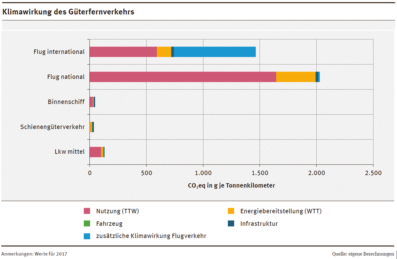 Dabei wurden alle relevanten Verkehrsträger (Straße, Schiene, Wasser und Luft) sowie die zugehörigen Verkehrsmittel bzw. Verkehrsarten hinsichtlich der ökologischen Wirkungskategorien ausgewertet. Dies sind Treibhausgase, Luftschadstoffe und Flächenbelegung sowie in der Langfassung zusätzlich auch Ressourcenverbrauch, Lärm und Verkehrsunfälle. Darüber hinaus wurden auch die durch den Verkehr entstehenden Umweltkosten für jede Wirkungskategorie berechnet.