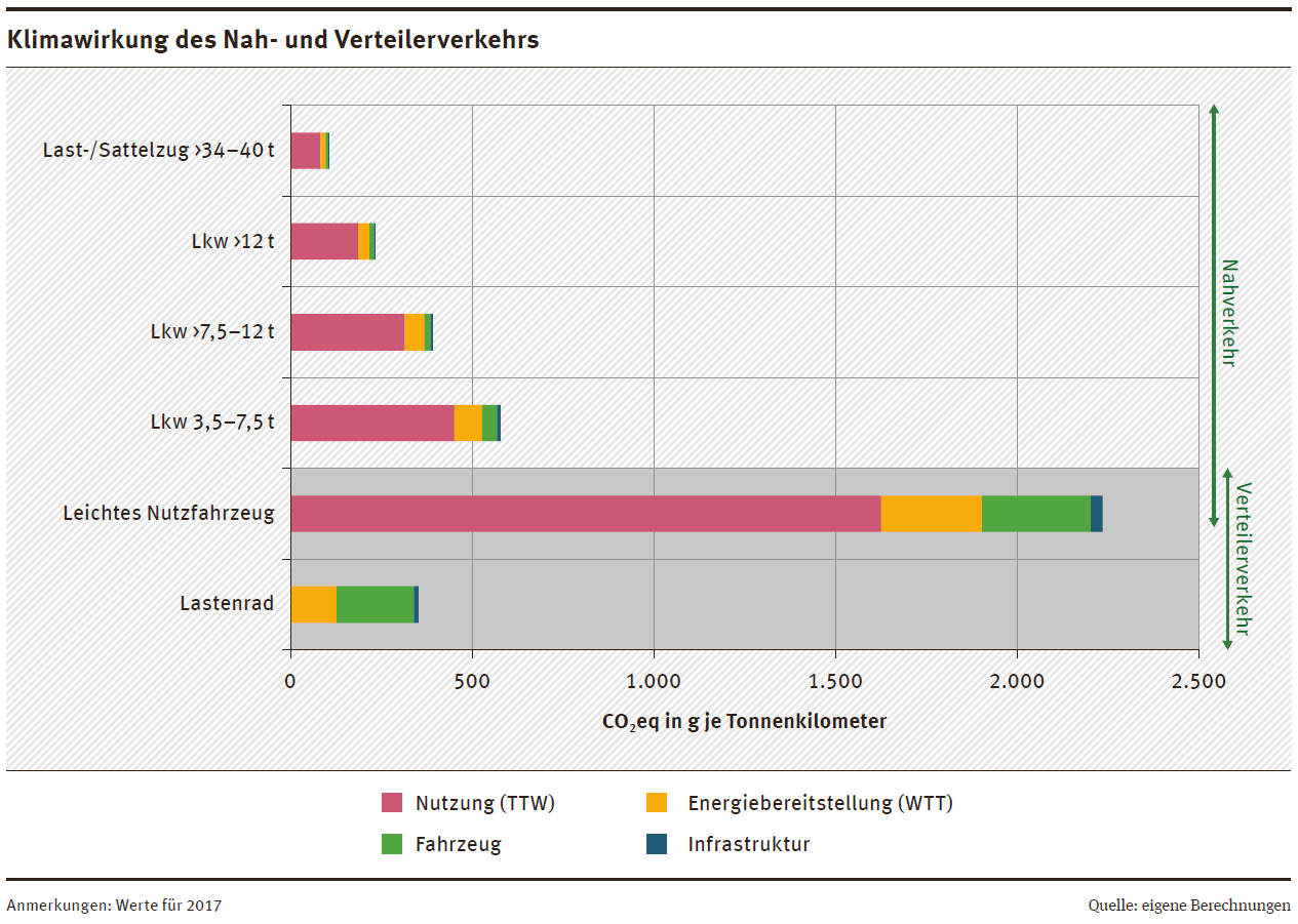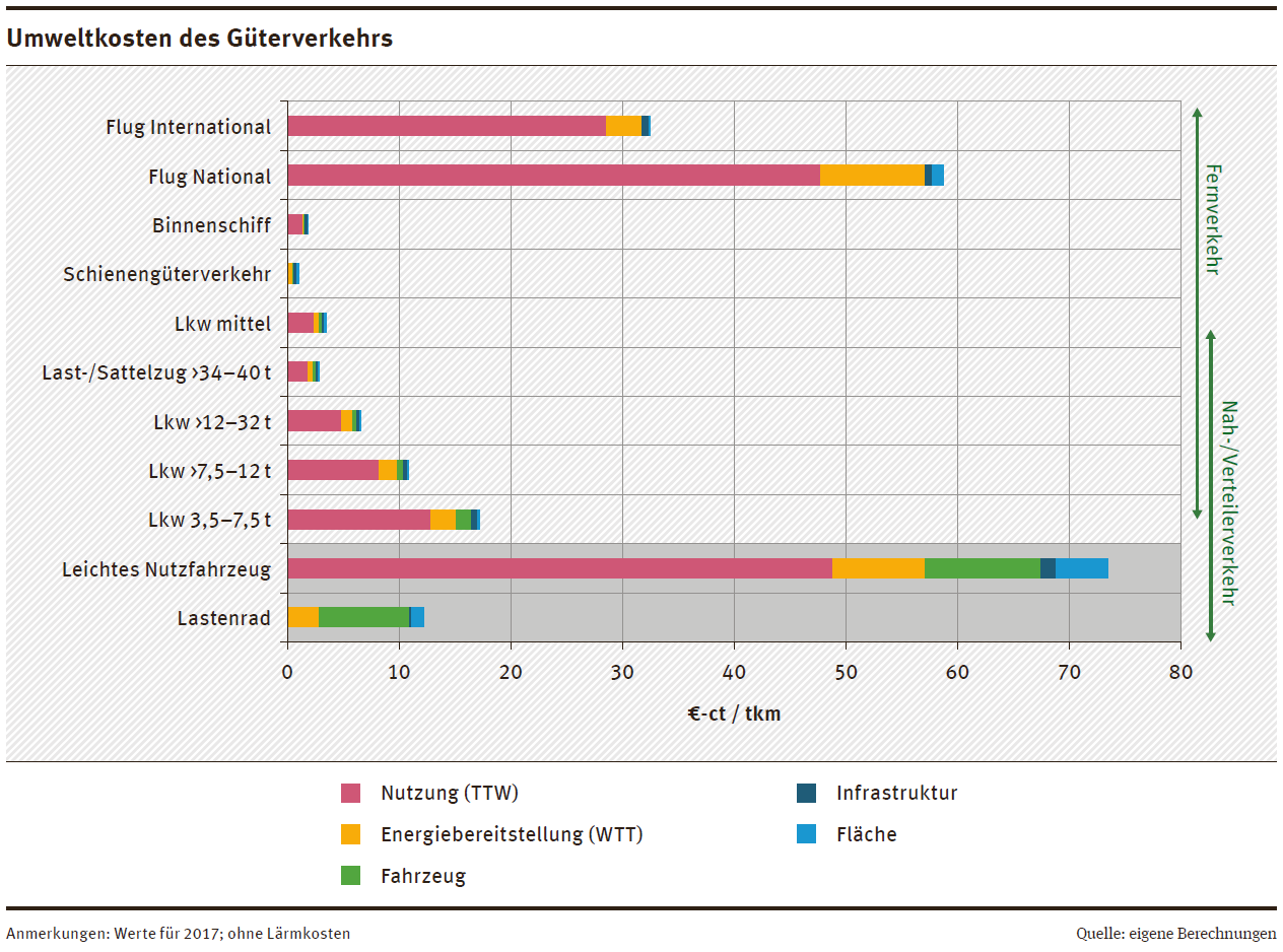 Es lässt sich im Ergebnis festhalten, dass sich hinsichtlich der Rangfolge der Umweltfreundlichkeit auch unter Berücksichtigung aller Lebenswegabschnitte eines Verkehrsmittels (gegenüber der bisher vorwiegenden Fokussierung auf Verkehrsmittelnutzung und die vorgeschaltete Energiebereitstellung) nichts ändert: Weiterhin verursachen die Verkehrsarten der aktiven Mobilität (z. B. Gehen und Fahrradfahren) sowie die motorisierten Verkehrsarten des ÖPNV (z. B. Linienbus, S- und U-Bahn, Straßenbahn), Bahn, Fernbus und Binnenschiff deutlich geringere Umweltwirkungen und Umweltkosten als Pkw, Lkw und Flugzeug, wie die nachfolgenden Abbildungen zeigen.
