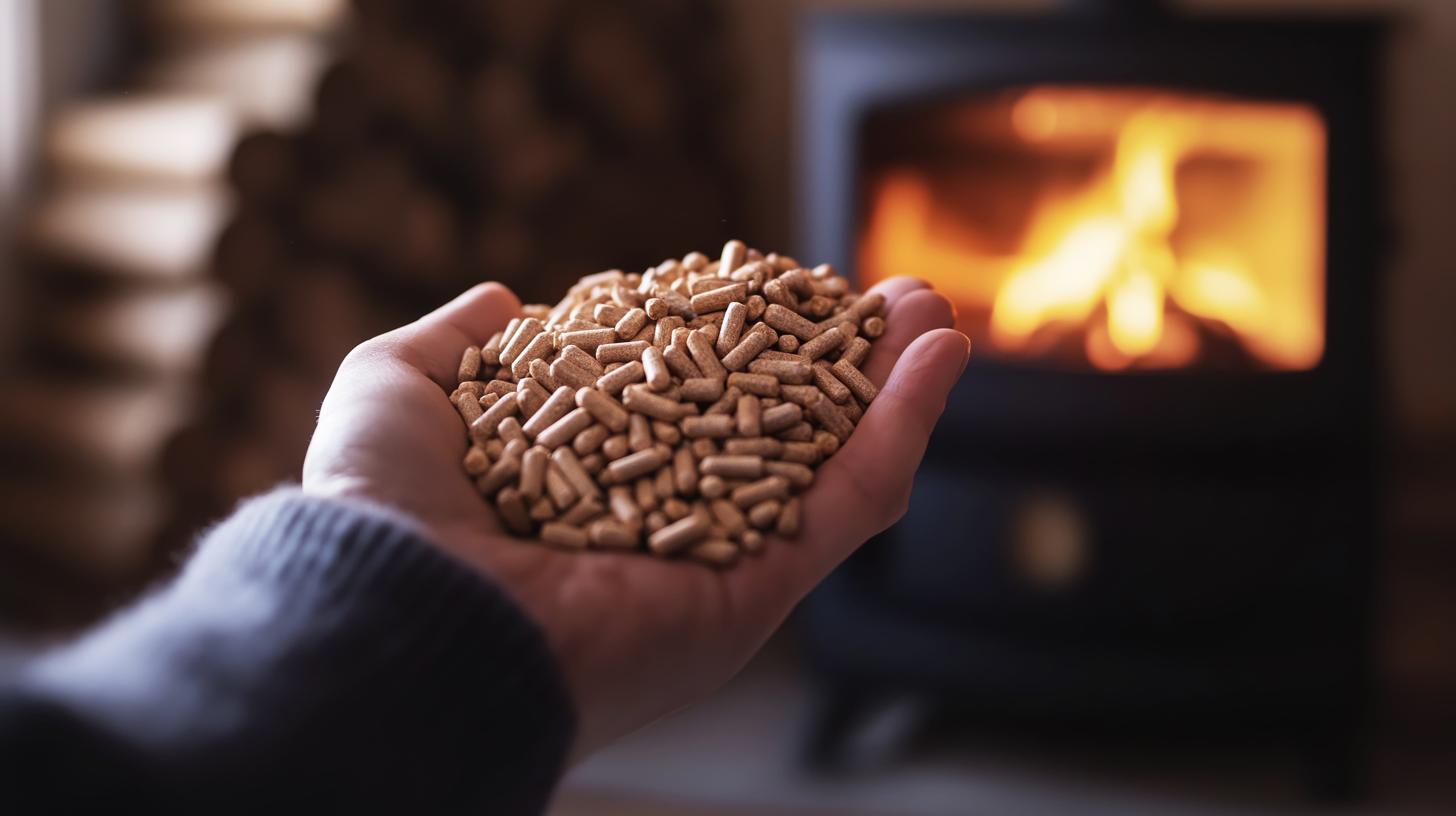 Eine Hand hält eine große Menge Holzpellets in der offenen Handfläche, während im Hintergrund ein brennender Kaminofen zu sehen ist.