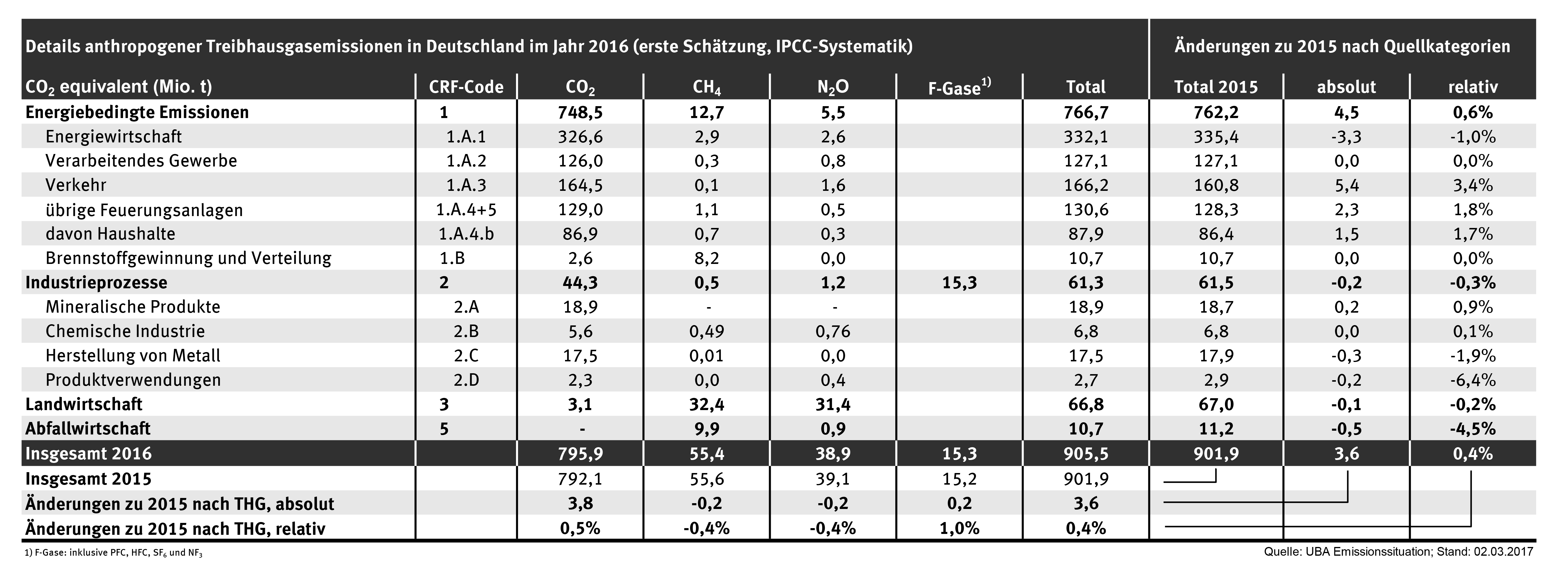 Economic development in 2016 raised the gross domestic product by 1.9%, with variable production trends in the individual industrial sectors. Gross refinery production increased, whereas steel production and therein the pig iron production in particular, was slightly weaker. Chemical production remained stable. The slight rise in emissions of fluorinated greenhouse gases can be traced back to the use and disposal of commercial refrigeration units and mobile air conditioning systems.