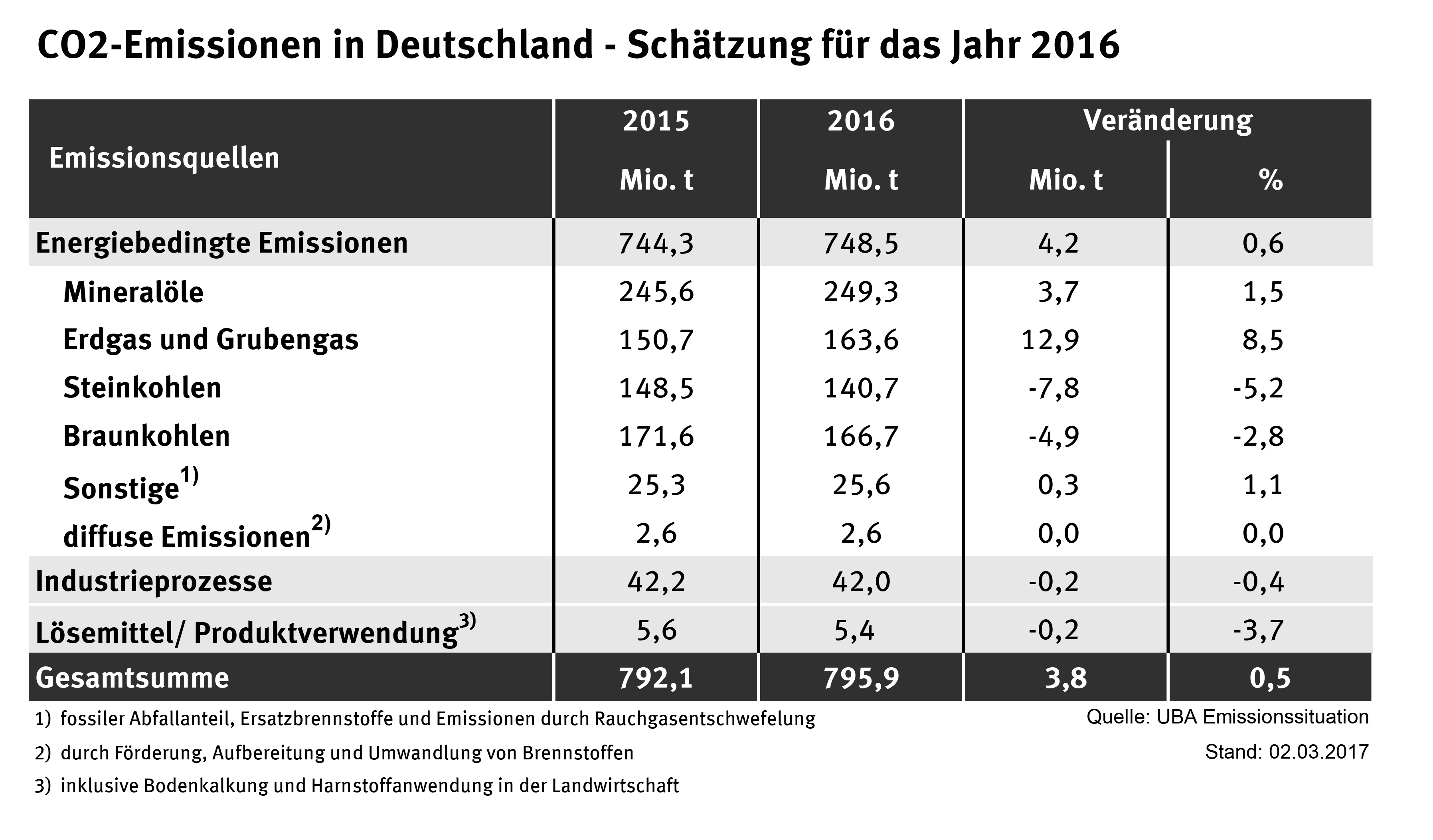 The present results represent initial detailed estimates. They are derived from a system of modelling and extrapolation of trends based on detailed estimates published in January for 2015. The data comes from initial survey data for 2016 published by the Working Group on Energy Balances (Energy Balances Group), a range of official monthly statistics on energy consumption, production figures from industrial associations, and other additional information (e.g. degree day figures). This calculation method reduces the accuracy of estimates compared to those in the detailed calculations.