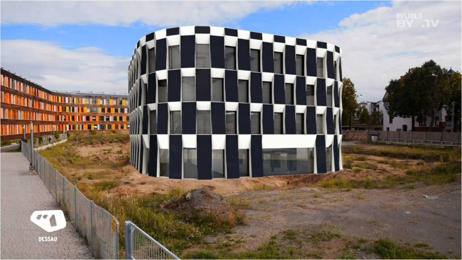 The extension building will be constructed as a federal project. The building, commissioned to Anderhalten architects of Berlin by the building authorities in Saxony-Anhalt acting on behalf of the Federal Government, has an unusual exterior with an amorphous shape and facade structure. An intelligent folding technique enlarges its surface on which photovoltaic elements alternate with window fronts. The photovoltaic panels will be installed at a 75-degree angle and thus achieve a higher yield than if they were to stand vertically.