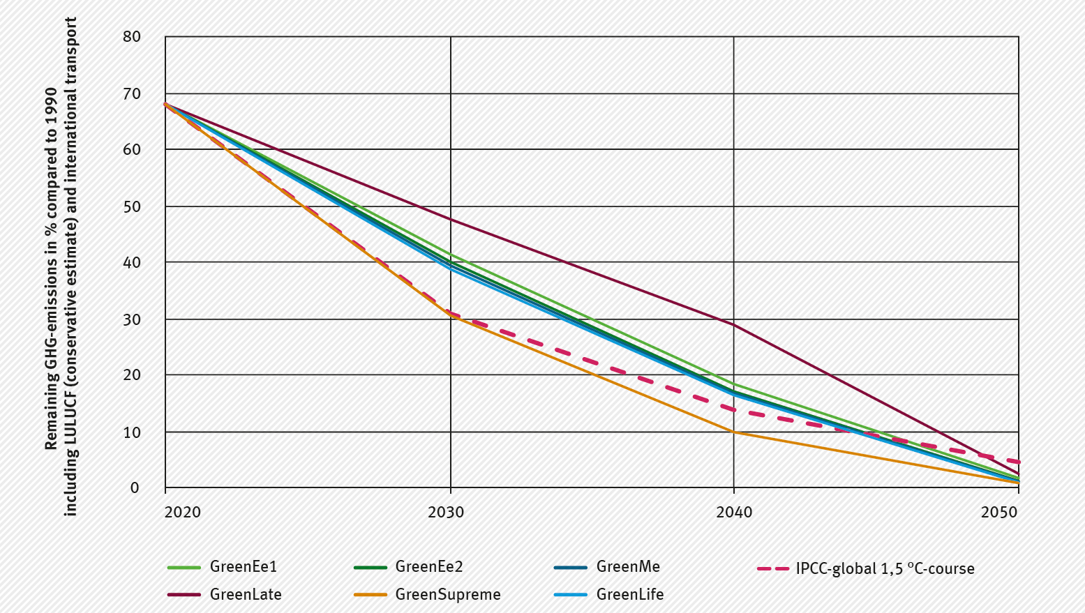 The GreenSupreme scenario describes the fastest possible reduction of greenhouse gas emissions and raw material consumption up to 2050. A quick phase-out of coal use by 2040 is a critical factor. Efficient and resource-efficient technologies such as heat pumps to generate space heat as well as increasing demand for durable, repairable and resource-efficient products are preferred. The scenario succeeds in reducing GHG emissions by about 97 percent by 2050 compared to 1990. If natural sinks are taken into account through sustainable agriculture and forestry (LULUCF), reductions of 100 percent are possible, even sinking carbon dioxide (CO2) from the atmosphere. GHG neutrality is possible without nuclear energy and technical sinks such as carbon dioxide capture and storage.