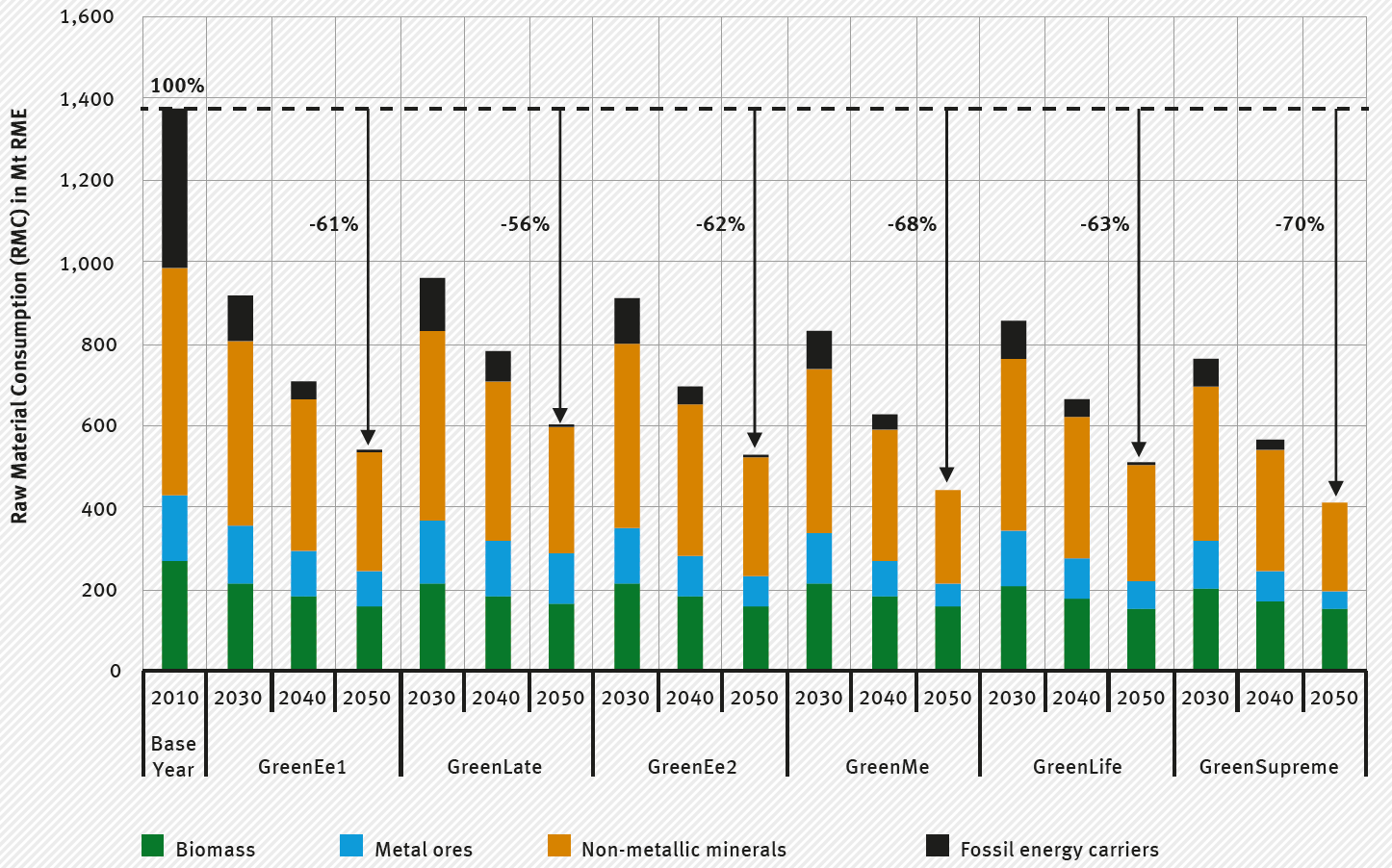 Greenhouse gas neutrality results in a large reduction of raw material consumption (RMC). In the GreenSupreme scenario, RMC in 2050 is reduced by 70 percent compared to 2010. This scenario focuses on technical measures targeting energy- and materials efficiency. Furthermore, lifestyle changes such as choosing more durable and repairable products, space-saving forms of building, tapping the full recycling potential for materials, widespread material substitution such as more wood building and the use of innovative materials such as textile-reinforced concrete can further reduce demand for raw materials. The temporary increased demand for resources to drive the transition of the energy system should be contained by deploying a broad technology mix. For example: the batteries which replace today's conventional lithium-ion batteries can reduce the demand for lithium and cobalt for battery-electric vehicles. Newer generators in wind turbines can reduce their demand for copper and rare earths.