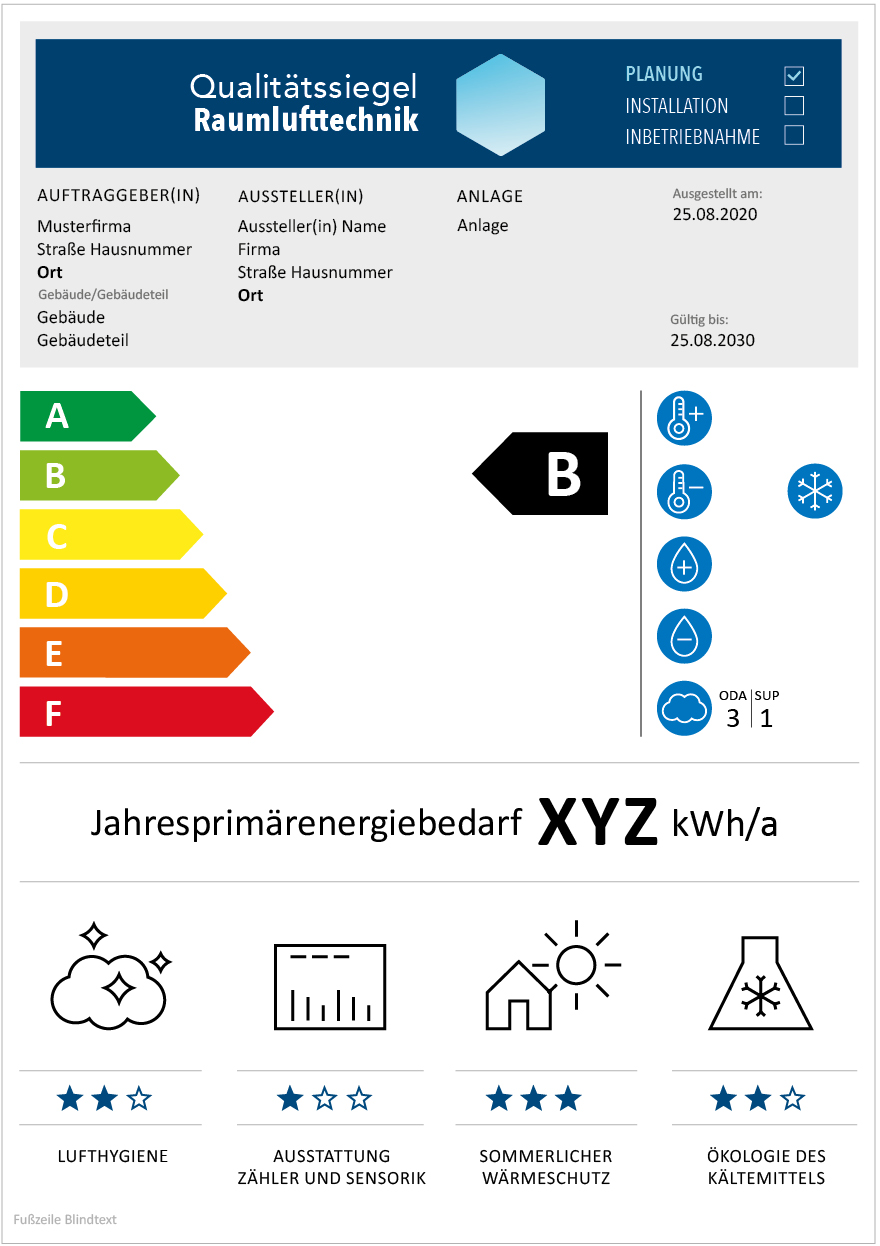 Ein(e) unabhängige(r) Prüfer(in) bestätigt in drei Projektphasen mit einem Zertifikat, dass die Raumlufttechnik in einem Gebäude die Kriterien des Qualitätssiegels erfüllt.