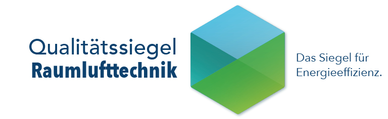 Das Bild zeigt das Logo des Qualitätssiegels Raumlufttechnik. Es besteht aus dem Schriftzug selbst und rechts daneben einem Sechseck, das auf der Spitze steht und in Blau- und Grüntönen gefüllt ist. The new quality seal for air conditioning systems certifies good air quality and energy efficiency