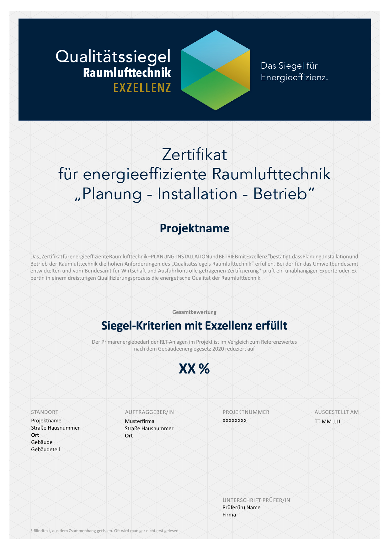 Das Bild zeigt das Zertifikat, das aus einer dunkelblauen Kopfzeile mit Logo und dem Haupttext mit weiteren Angaben zum Projekt besteht. Zertifikat für Raumlufttechnik