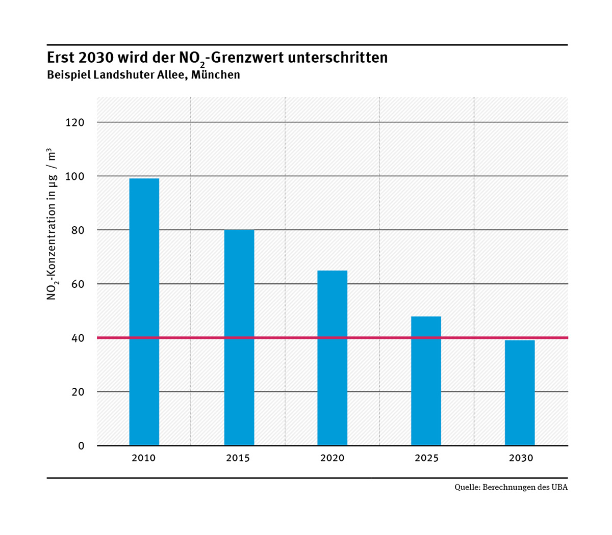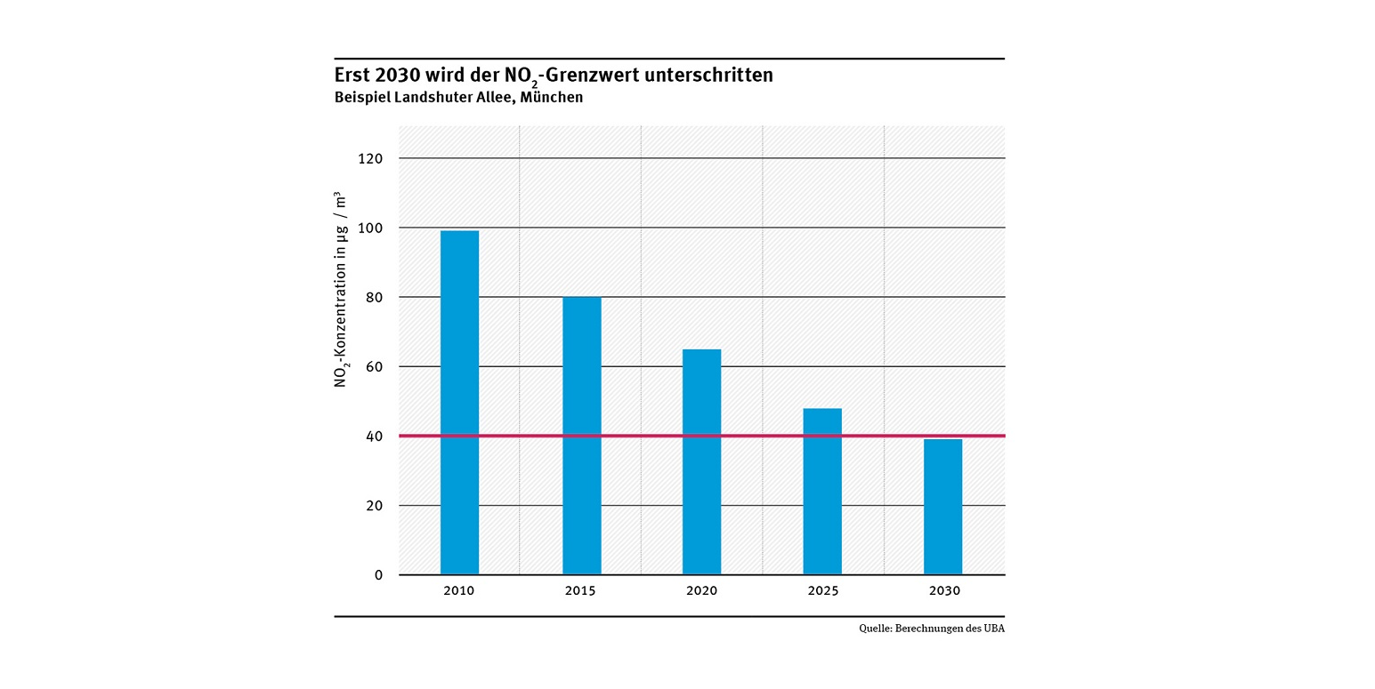 Nitrogen dioxide is still the polluting the air in Germany’s cities. It is especially harmful to people who suffer asthma and can trigger shortness of breath and bronchitis. Calculations by UBA show that if no further measures are taken in areas with the highest levels of NO2 pollution (on Landshuter Allee in Munich, for example), it will only be possible to reach an annual mean limit of 40 micrograms per cubic metre of air around 2030. This is the earliest time at which a renewal of the vehicle fleet with diesel cars with low real driving emissions will become effective. "Our recommendation for policy makers is to enable local authorities to take measures which will reduce nitrogen dioxide pollution in city centres quickly. This would include prohibiting the entry of old diesel cars, also those up to pollutant emission category Euro 5, into the existing low-emission zones of metropolitan areas", said Maria Krautzberger. She hereby addressed an issue which met with very little support for the Federal Environment Ministry from the Land ministries at the last environmental conference in Augsburg held in late October.