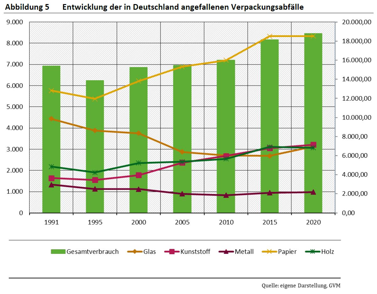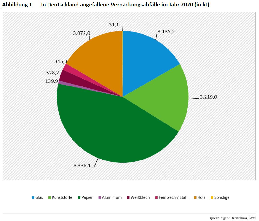 Total consumption includes the following types of packaging: Sales packaging, reusable packaging, transport packaging, packaging of fillers containing harmful substances and disposable components of reusable packaging. The recycling rates indicated for the total volume refer to all packaging waste generated in Germany that was recycled within Germany or abroad. There is a difference between these and the quotas specified in the German Packaging Act. The latter are the minimum quotas that the dual systems must achieve for the packaging subject to mandatory participation in the system. The latter is packaging filled with goods and outer packaging that typically accumulates as waste at the end consumer after use. The recycling quotas of the Packaging Act are not determined in relation to the amount of packaging waste generated, but rather in relation to the participation quantities and the amount of lightweight packaging collected. Information on the fulfilment of these quotas will be published separately at a later date.The point of intersection for the calculation of Germany’s recycling rates has shifted from the start of the recovery process to the end of the process chain. This new point is legally binding as of the 2020 reporting year. Consequently, the points of calculation remain the same, but material losses up to the quota intersection are mathematically deducted from the recycling rate. Ultimately, recycling rates are lower compared to the previous calculation method.