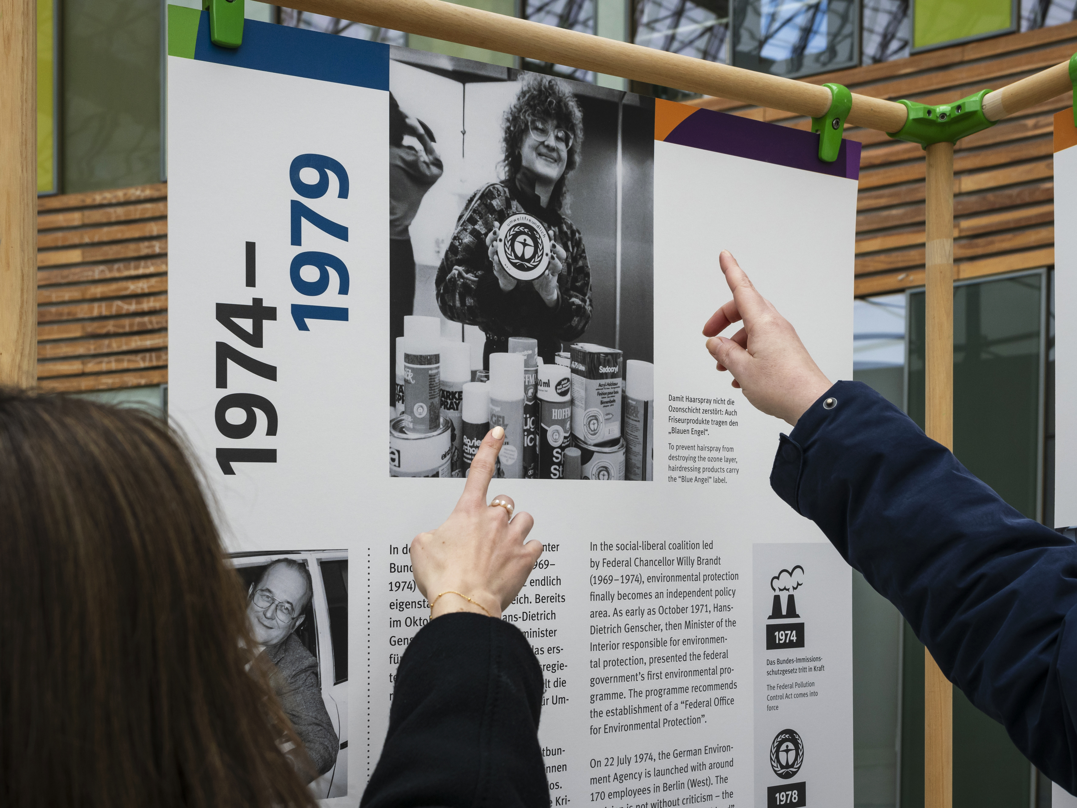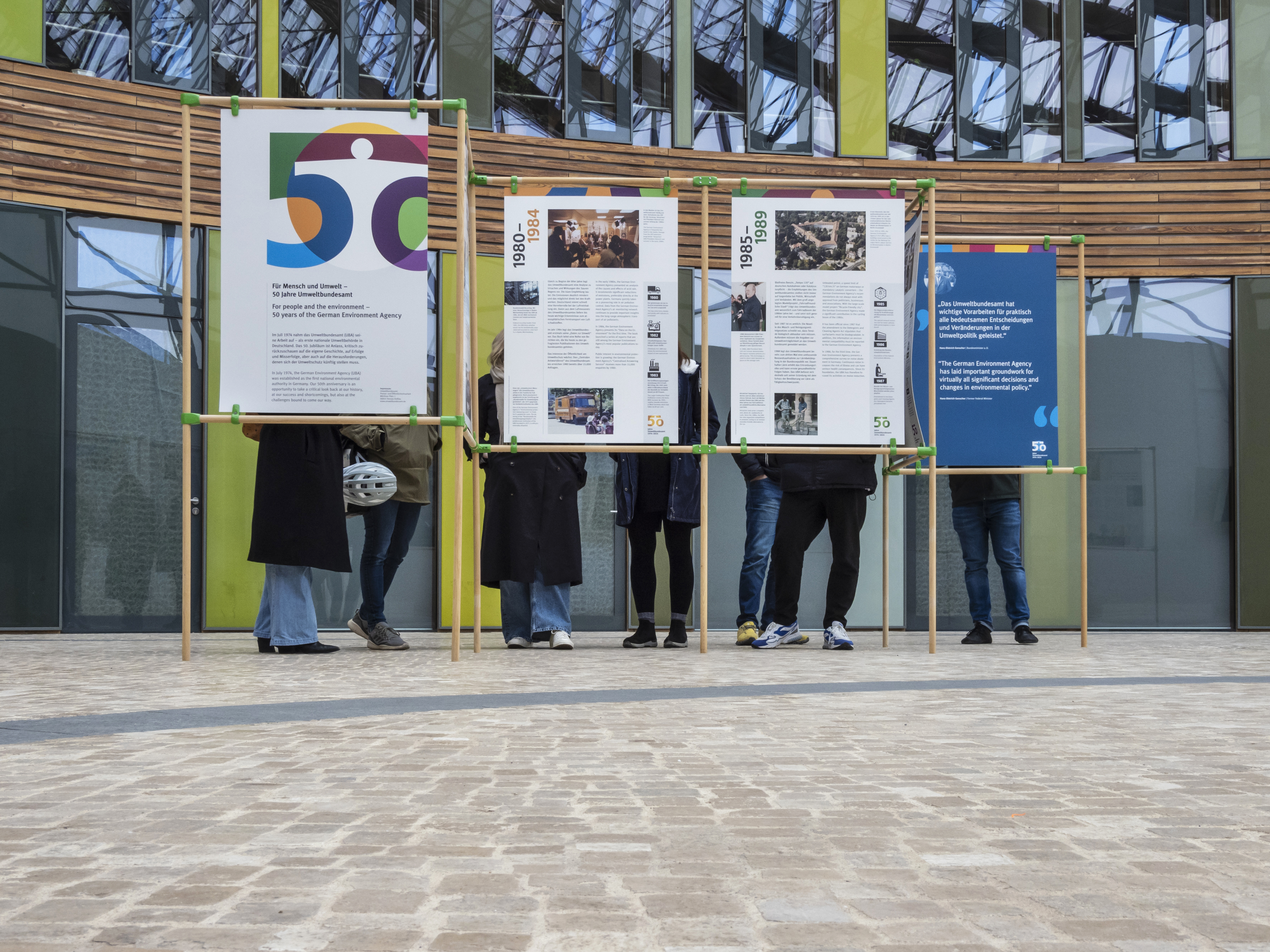 Foto mit den neuen UBA-Ausstellungstalfen in Dessau-Roßlau. Zu sehen ist ein Teil der Ausstellung mit Menschen hinter den Tafeln. Neugierig, welche Themen uns in den vergangenen Jahren bewegt haben? Besuchen Sie die Ausstellung!