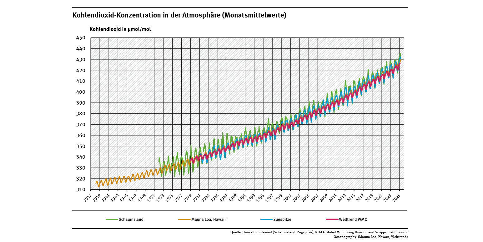 Concentrations of atmospheric CO2 are rising steadily worldwide. The main cause is the firing of coal, petroleum and natural gas which continues to be very intensive. CO2 is very persistent in the Earth’s atmosphere – about 120 years on average – which explains its relatively even distribution around the world as it becomes increasingly concentrated. The environmental CO2 monitoring by the air measuring network of the German Environment Agency is part of the international Global Atmosphere Watch (GAW) programme of the UN World Meteorological Organization WMO.