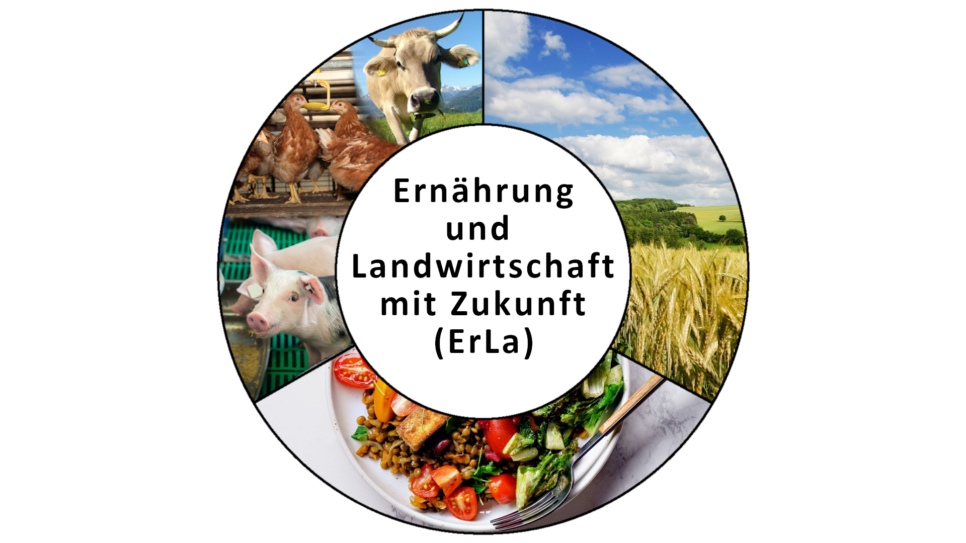The image shows a circular collage of individual photos depicting animal husbandry (chickens, pigs, cattle), a wheat field, and a plate with a vegetarian dish made from vegetables and lentils. In the center of the circle is the lettering “ErLa” (Ernährung und Landwirtschaft mit Zukunft, or “Nutrition and Agriculture with a Future”).