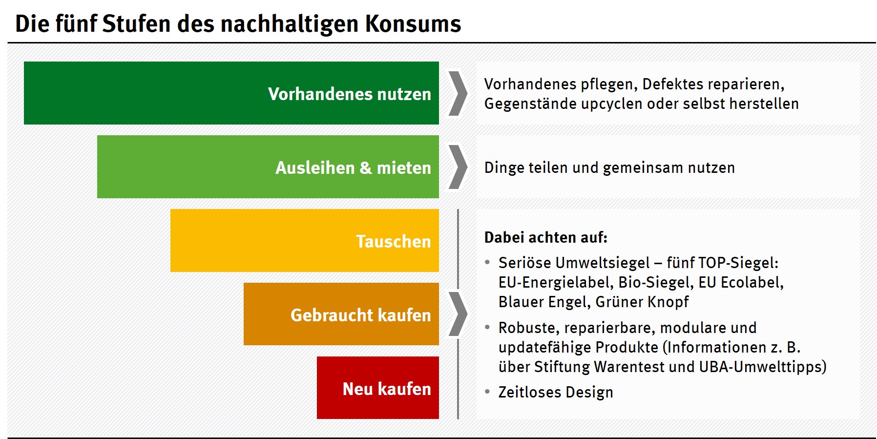 Infografik mit Handlungsempfehlungen, wie man nachhaltig im Alltag konsumieren sollte Die fünf Stufen des nachhaltigen Konsums