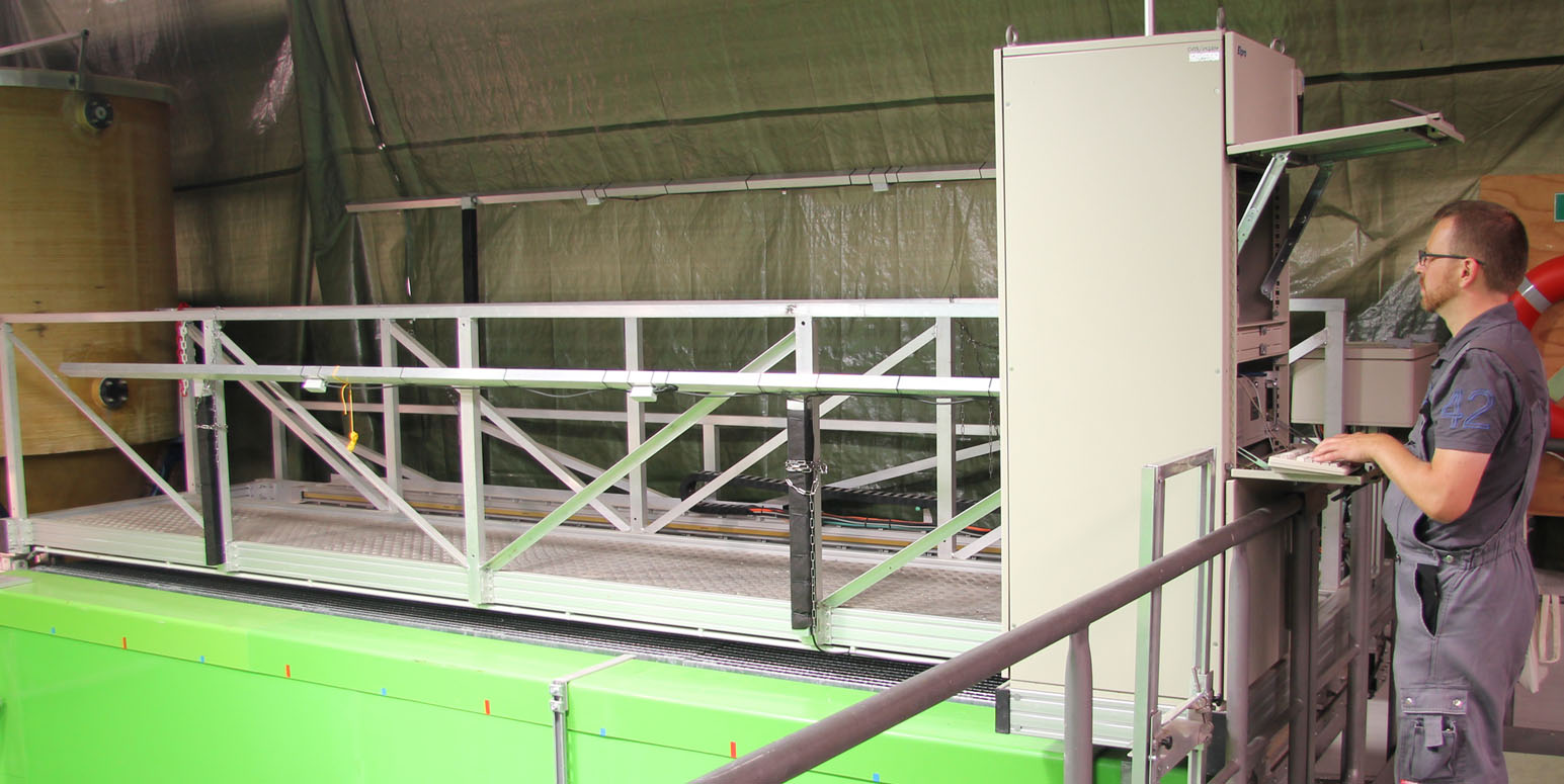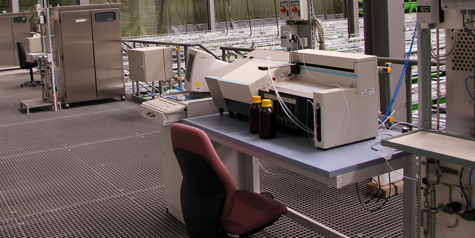 For maintenance work (e.g. on online measuring equipment), for manual operation of the screw pumps and for operating the rough and fine dosing systems. The rough dosing systems are used to add large amounts of water, which can be pre-mixed according to experimental demands. The fine dosing systems allow small amounts of substances to be added in various ways (e.g. continuously over a longer period of time). The measuring equipment installed on the work platform and designed for determining the total nitrogen concentration (TNb) and the concentration of total organic carbon (TOC) can be used for single as well as for continuous (online) measurements.