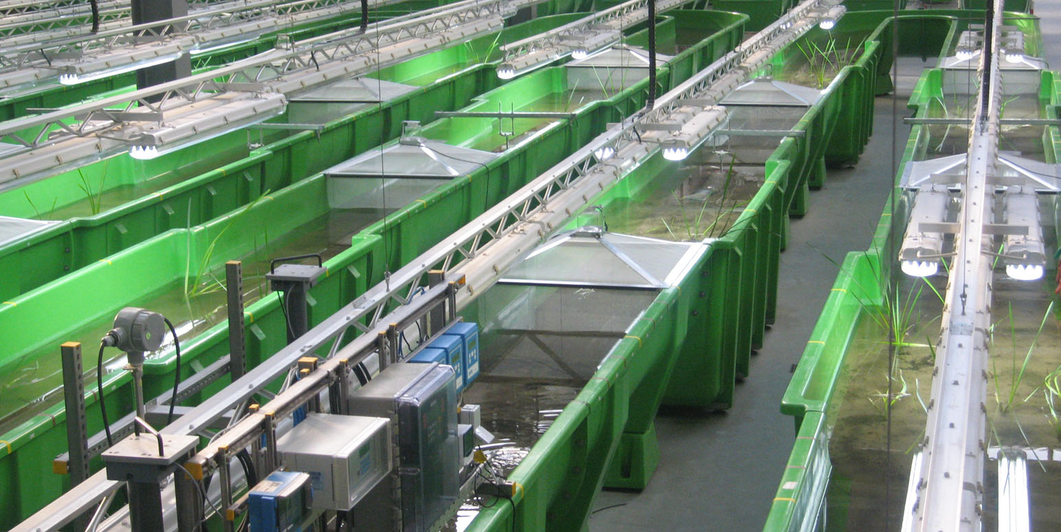 Up to 8 indoor and 8 outdoor stream mesocosms can be constructed by combining riffle segments and pools within a “modular” system. Each stream can be varied in length. For example, 16 independent streams (8 indoor and 8 outdoor), each up to 106 m in length or 2 streams of approx. 800 m length can be set up. The volume capacity is approx. 36,000 litres per a 106 m long stream. For further details, please refer to the technical data sheet.
