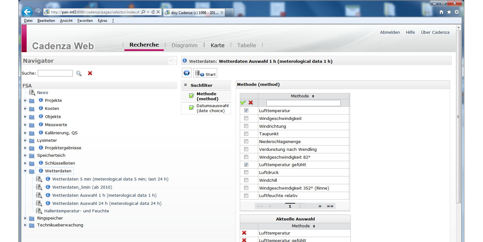 The ponds and streams of the FSA are equipped with an online measurement system, which also includes the meteorological station at the field station of the UBA. Every 10 s, up to 400 data are measured and temporarily stored in a Round Robin database (RRDB). Depending on the project requirements, parts of the data will be stored half automatically or aggregated data (e.g. mean per hour) will be transferred automatically into the FSA-DB. For each measurement device, limit values can be set separately e.g. for an email notification system in case of system failure (alarm system).