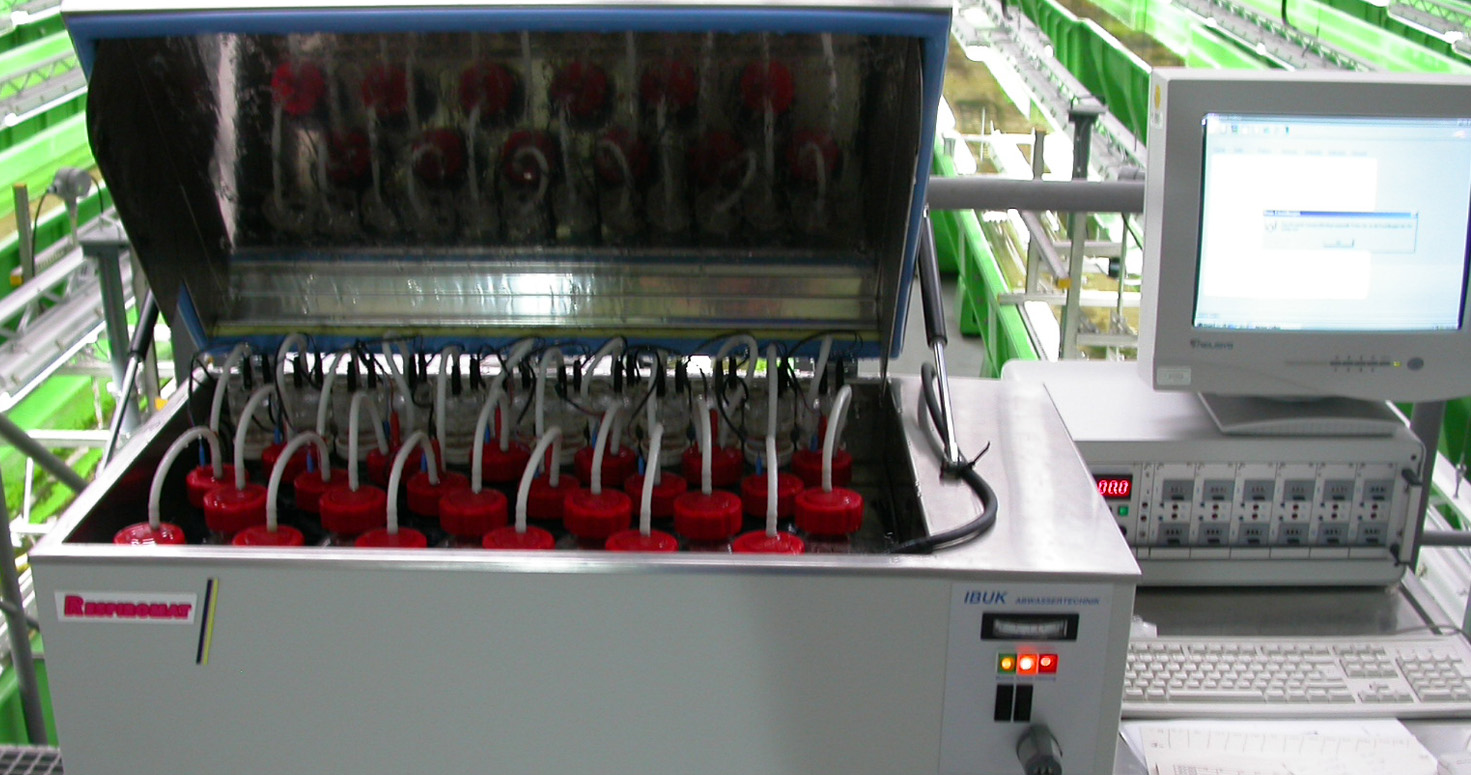 In the ponds the online measurements include oxygen, conductivity, pH, water temperature, and water level. The online data are transferred to the control room continuously.