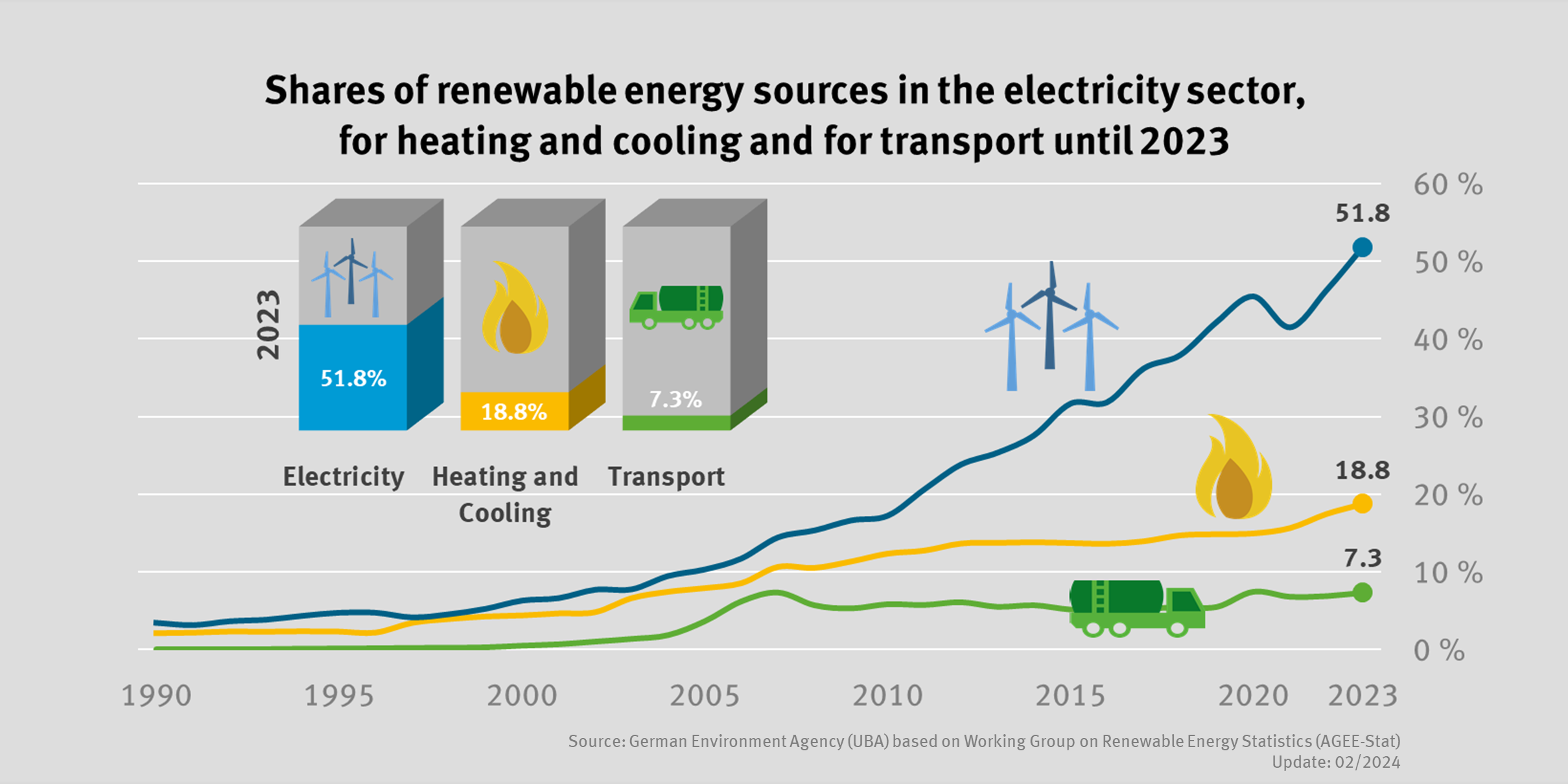 According to current analyses by the Working Group on Renewable Energy Statistics (AGEE-Stat), more renewable electricity than ever before was generated in 2023 (272.4 terawatt hours (TWh), a plus of 7 per cent compared to 2022 with 254.6 TWh). While overall electricity consumption decreased due to economic factors (-5 per cent compared to 2022), the share of renewable energy in gross electricity consumption rose to a new record of 51.8 per cent.