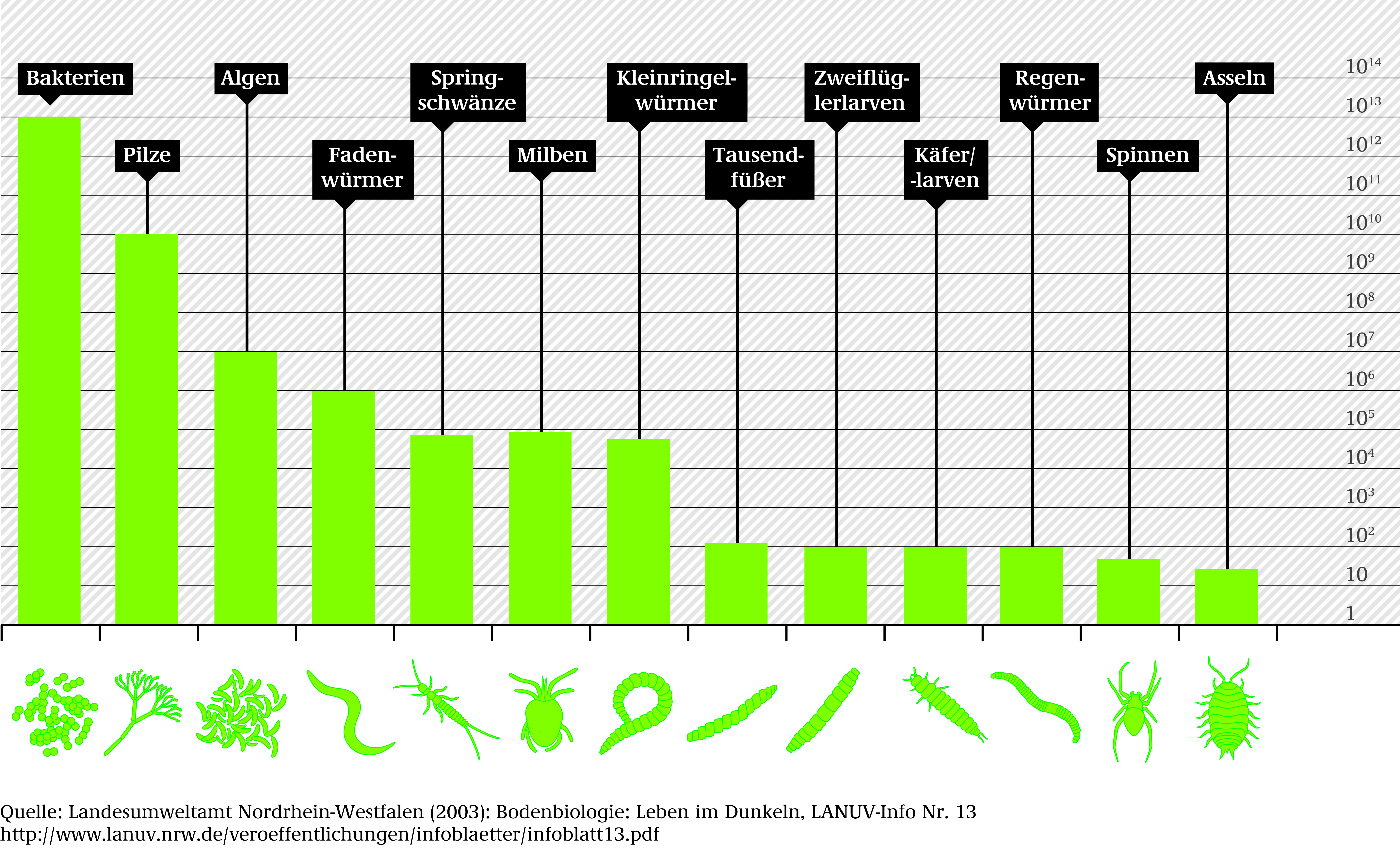 A gram of soil contains billions of microorganisms: bacteria, fungi, algae and protozoans. A mere one square meter of soil is home to anywhere from hundreds of thousand to millions of soil fauna such as nematodes, earthworms, mites, woodlice, springtail, and insect larvae. A hectare of soil rooting layers contains around 15 tons of live weight – the equivalent of around 20 cows. In other words, immeasurably more organisms live in the soil than on it.