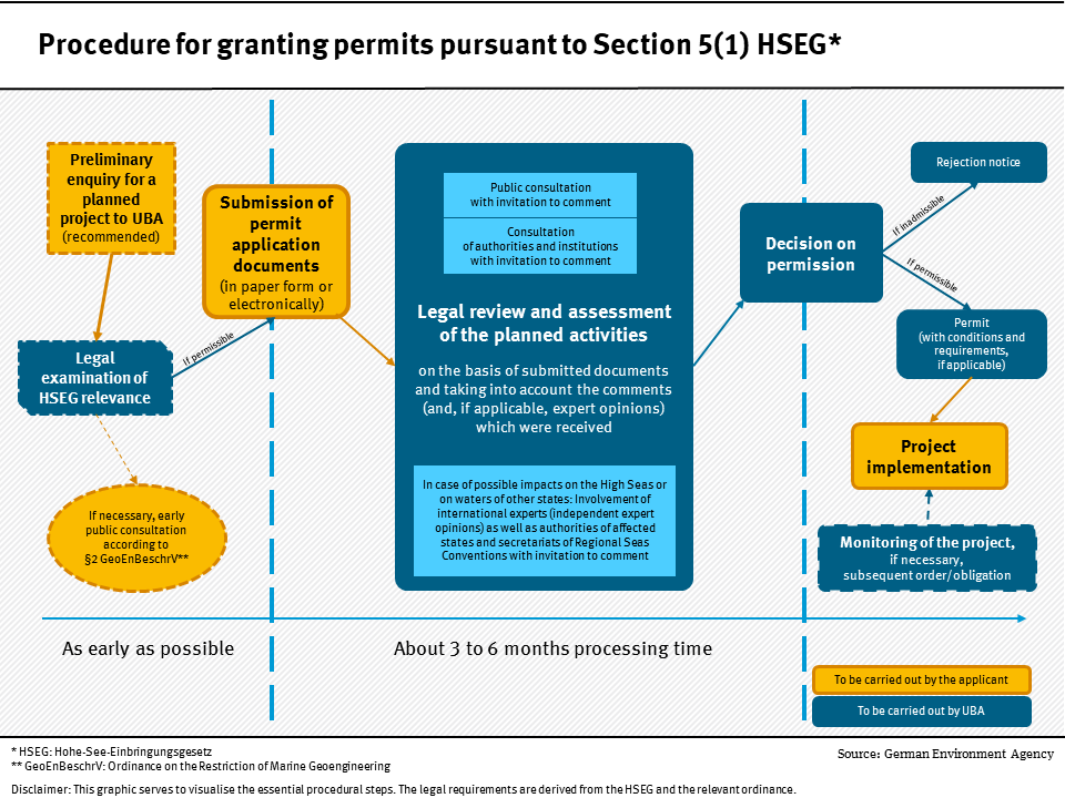 For the purpose of observing (monitoring) the affected environment at the project site, project-specific and risk-appropriate continuous measurement campaigns must be planned as part of the project and duly reflected in the financing plan. Due to the various national and international stakeholders involved, a processing time of up to six months should be expected. The respective state authorities are responsible for the implementation of scientific projects on marine geoengineering in coastal waters. The same requirements apply to the conditions for the approval of such projects as those under the HSEG (Article 45 Abs. 2 Wasserhaushaltsgesetz, WHG).