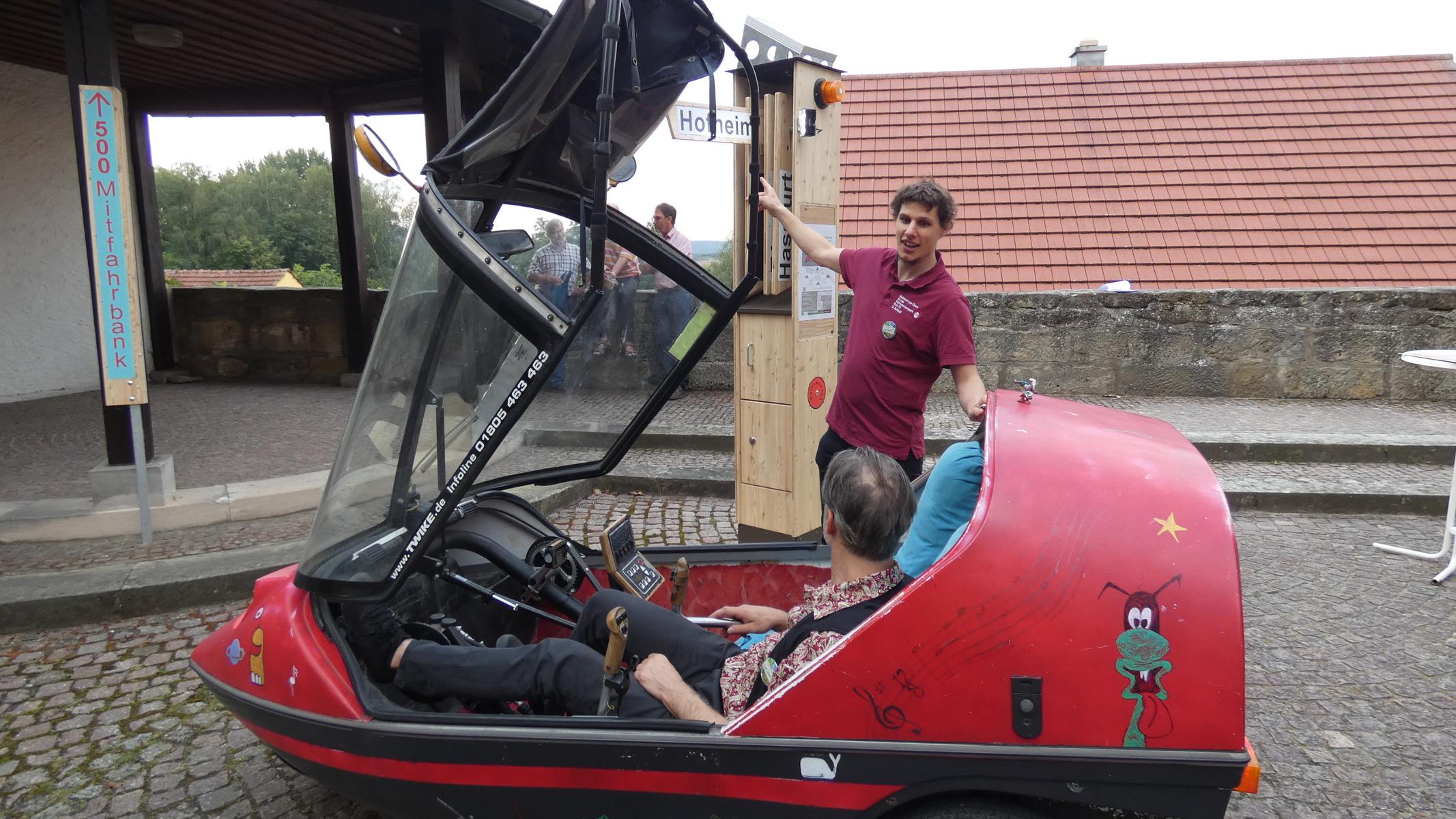 Zum Preisträger des vom Verein ausgerufenen Ideenwettbewerbs gekürt, stellte er seine aus heimischer Lärche gebaute Mitfahrsäule mit besonderen Features vor. Betätigt die Person an der Mitfahrsäule den Haltewunsch-Knopf, signalisiert ein gelbes Blinklicht den Mitfahrbedarf. Herausklappbare Schilder zeigen das Fahrziel an. An drei Seiten der Säule können Info-Flyer mit Hinweisen zur Nutzung der „Station“ angebracht werden. Für ihre Sicherheit finden Fahrgäste in einem Extra-Fach Mitfahrkarten, auf denen sie die bevorstehende Fahrt dokumentieren und anschließend in ein Fach einwerfen können, das dann z. B. die Polizei leert. Mit diesem Tool soll eventuellen Delikten vorgebeugt werden. Unter finanzieller Beteiligung der Allianz „Hofheimer Land“ wird der Prototyp der Mitfahrsäule in Rügheim, einem Ortsteil der nahegelegenen Stadt Hofheim in Unterfranken, zum Einsatz kommen.