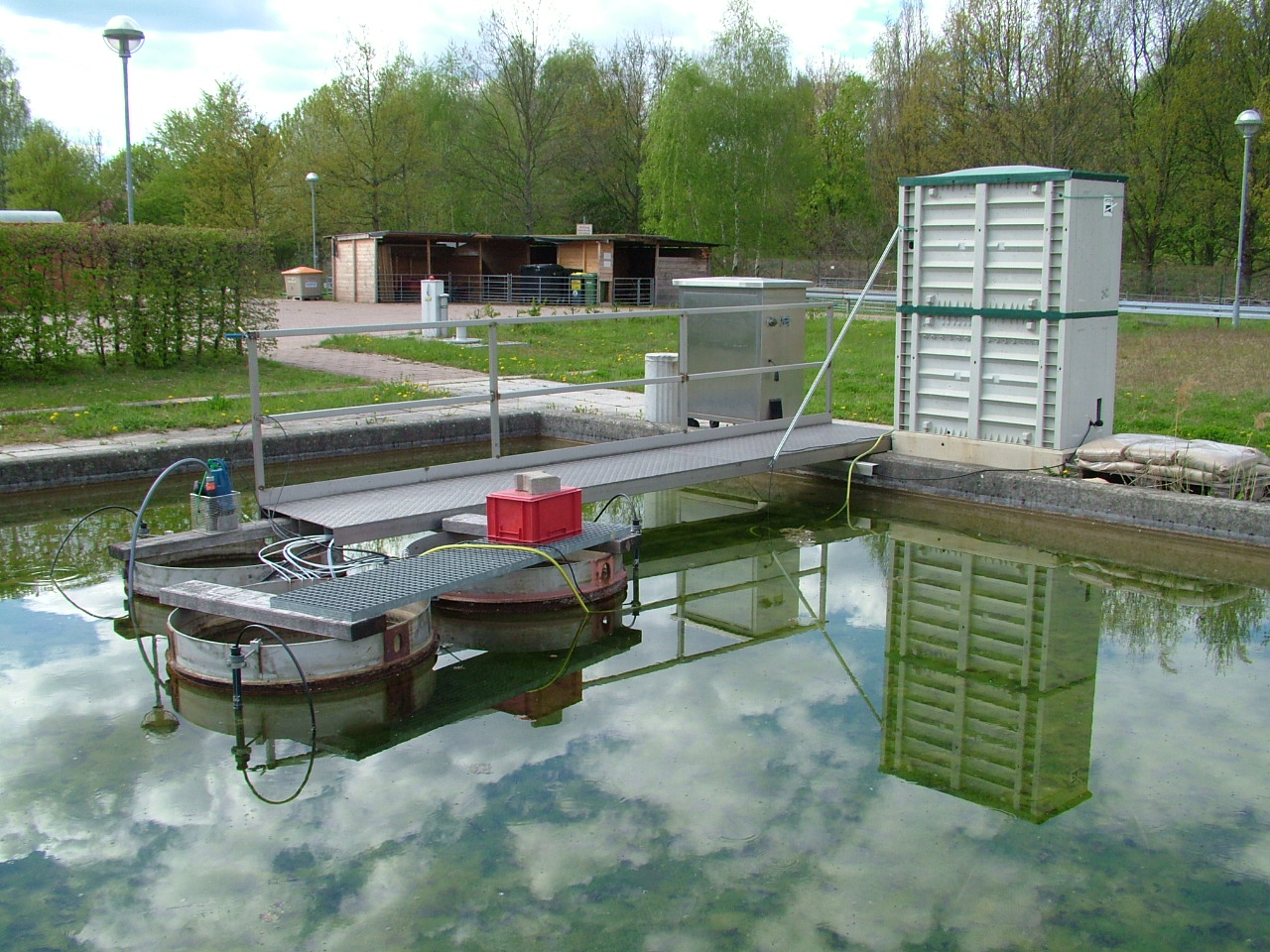 Sind keine Schadstoffe enthalten, wird das Wasser in den Speicherteich zurück gefördert. Anderenfalls wird es aufbereitet oder direkt ins Abwasser geleitet. Der Wasserverlust wird durch Betriebswasser aus dem Wasserwerk vor Ort ausgeglichen. In einem der beiden Langsamsandfilterbecken befindet sich die sogenannte „Enclosure-Anlage“. Sie besteht aus 3 wassergesättigten Sandsäulen von 1,5 m Länge. Randbedingungen wie Fließgeschwindigkeit, Wasserhärte und DOC-Konzentrationen können vor dem Versuch festgelegt werden. In einem Messschrank können hydrochemische Parameter wie pH, Leitfähigkeit, Redoxpotential und Sauerstoffgehalt des Säulenablaufs online erfasst werden. Eine Beprobung des Säulenfiltrats ist in 30, 50 und 90 cm möglich. Die Anlage bietet somit die Möglichkeit, den Schadstoffverbleib in Abhängigkeit einer kurzen Fließstrecke zu verfolgen.
