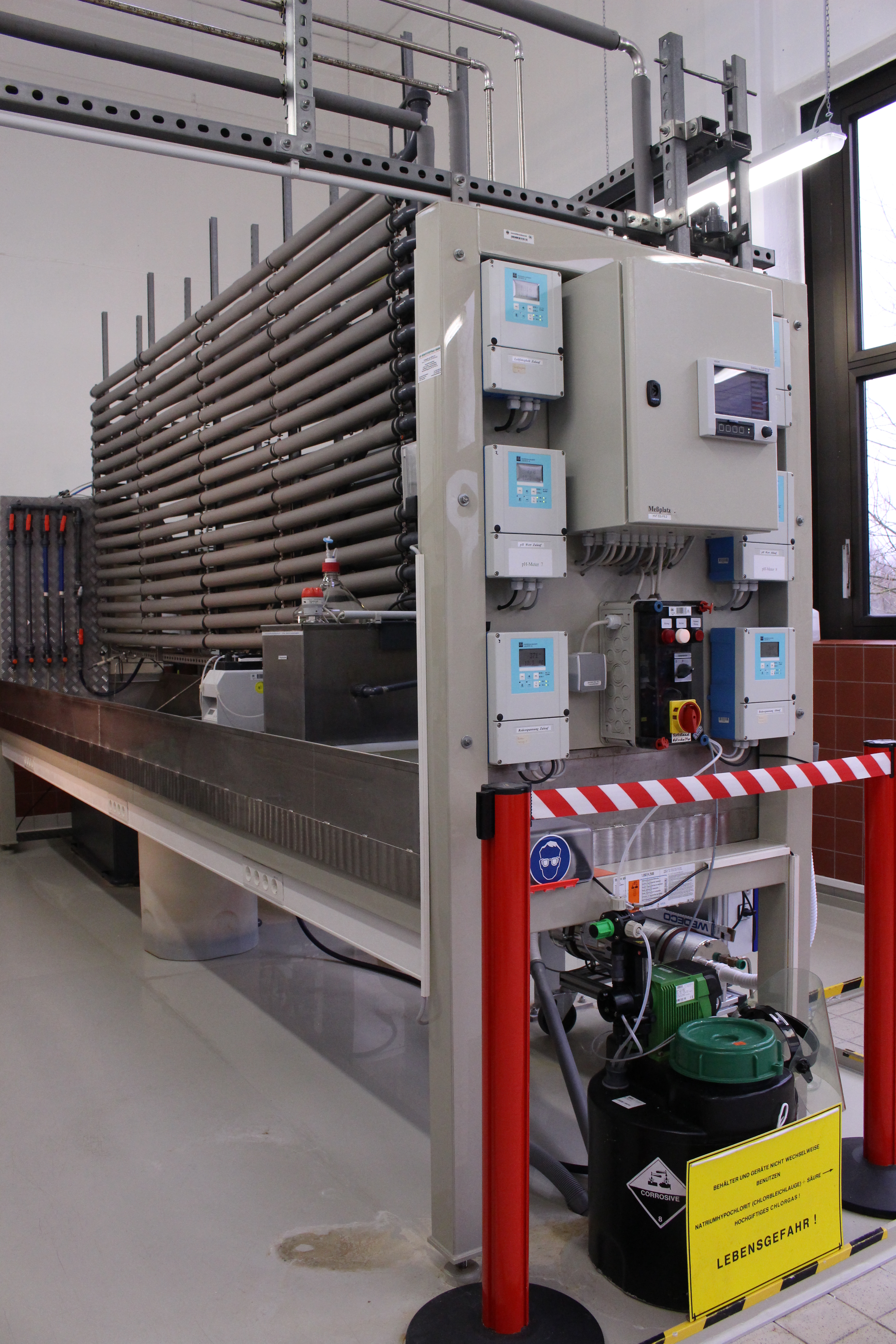 Um die Kontaktzeit zwischen Wasser und Desinfektionsmittel präzise definieren zu können, arbeitet der Teststand im Durchfluss. Durch eine 140 m lange PVC-U-Rohrleitung fließt kontinuierlich Testwasser mit einem Volumenstrom von 400 Litern pro Stunde. An verschiedenen Stellen der Rohrleitung sind Auslässe, d.h. Probenahmehähne, angebracht, aus denen kontinuierlich ein geringer Volumenstrom abfließt.